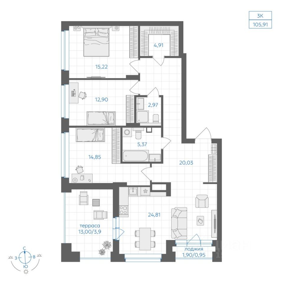 105 м² · Этаж 14 из 30
