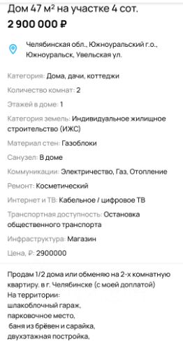 Продам дом с большим участком в Южноуральске! Продаю свой уютный дом с просторным участком в хорошем районе Южноуральска. Отличный вариант для тех, кто мечтает о своем уголке с возможностью обустроить территорию по своему вкусу! Дом небольшой, но очень уютный, идеально подойдет для семьи или дачного отдыха. Большой участок место хватит и для сада, и для огорода, и для зоны отдыха. Все коммуникации центральные, никаких хлопот с водой, отоплением и электричеством. Вся необходимая инфраструктура в шаговой доступности магазины, школы, детский сад, поликлиника, остановки общественного транспорта. Дом полностью готов для жизни. Документы в порядке, быстрый выход на сделку. Звоните, договоримся о просмотре!