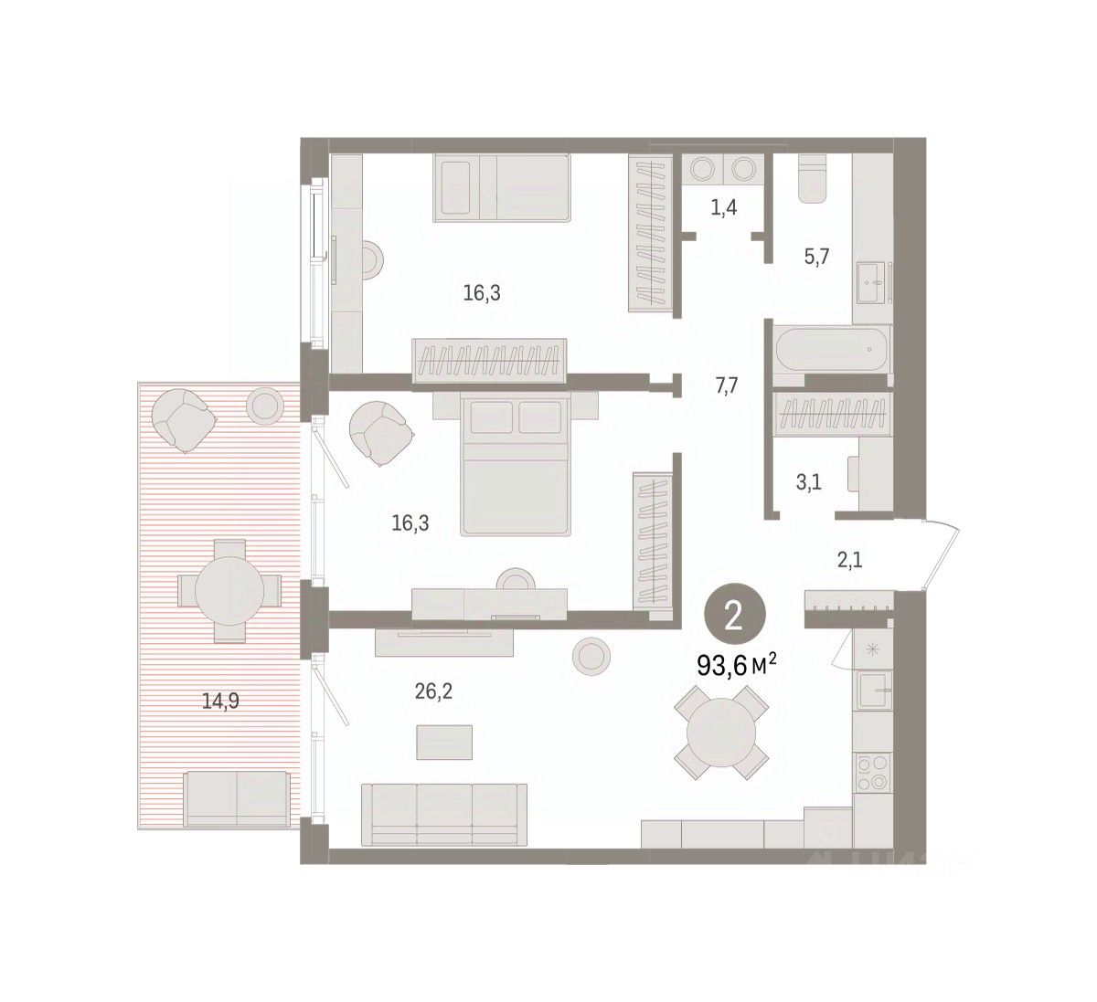 2-комн. квартира с предчистовой отделкой в ЖК ''Брусника в Эльтауне'' на 1 этаже. Общая площадь: 94.92 кв.м. Высота потолков 2.7 м. Квартира находится в корпусе 2. Дом монолитный, одноподъездный, высотой 8 этажей. На этаже 10 квартир. В подъезде 1 пассажирский и 1 грузовой лифт. Окончание строительства - 4 квартал 2028 года. Оформление сделки по договору долевого участия. Квартира с кухней-гостиной и двумя спальнями в Брусника в Эльтауне. Особенности планировки: гардеробная, новые лоты, окна в пол, панорамное остекление, постирочная, разнесённые спальни, терраса. квартиры в нашей базе: ЛТН01.1-Ж2.1.1. Квартал ''Брусника в Эльтауне'' расположился к северу-западу от Челябинска в окружении лесного массива, рядом с Лебединым прудом и Скалистым озером. Две главных слова, характеризующих Эльтаун, — концентрация и разнообразие. Его структуру формируют сразу несколько типов застройки — коттеджи, таунхаусы, квартиры в мало- и среднеэтажных домах, в перспективе нескольких лет здесь будут открыты десятки кафе, ресторанов, магазинов, аптек, медицинских и фитнес-центров. Для круглогодичного отдыха в городе построят собственный курорт. В Эльтауне будет действовать концепция непрерывного образования. Уже открыт муниципальный детский сад ''Ёлочка'' на 230 мест. В планах — инновационная школа на 1100 учеников. Кроме того, в Эльтауне организован Научно-исследовательский центр девелопмента МBA и МФТИ — одного из лучших вузов страны. Брусника стала полноправным девелопером Эльтауна. Мы построим здесь новый квартал со среднеэтажным жильём, богатым озеленением и разнообразной коммерческой и социальной инфраструктурой. Квартал Брусники расположен на въезде в город и станет его лицом. Недалеко от проекта проходит Новоградский тракт. По нему можно быстро добраться до Челябинска, озёр Увильды, Тургояк, Кисегач и Еловое, горнолыжных курортов ''Солнечная долина'', ''Евразия'' и ''Завьялиха'', парков ''Таганай'' и ''Зюраткуль''. Между Эльтауном и Челябинском курсирует автобус. Количество маршрутов и остановок общественного транспорта будет постоянно увеличиваться. До Челябинска — 5 минут на автомобиле До железнодорожного вокзала — 35 минут До аэропорта — 45 минут Проект Брусники в Эльтауне — комплексная застройка, состоящая из домов высотой не более 8 этажей. Территория Брусники разделена на несколько функциональных зон. Со стороны улицы Павленкова мы спроектировали фронт с коммерцией и приветственными площадями. На первых этажах домов — кафе, магазины, рестораны, кружки и образовательные студии. В глубине квартала расположатся общественные пространства с дождевыми садами, огородами и рощей. Ближе к лесу — пространство, которое мы назвали ''задний двор''. Здесь — игровые лужайки, плейхабы, луг для пикников и йоги, волейбольные площадки, воркаут. В этой же части, на границе квартала, предусмотрена парковка, на которой мы высадим взрослые деревья и кустарники. #2mDCz2