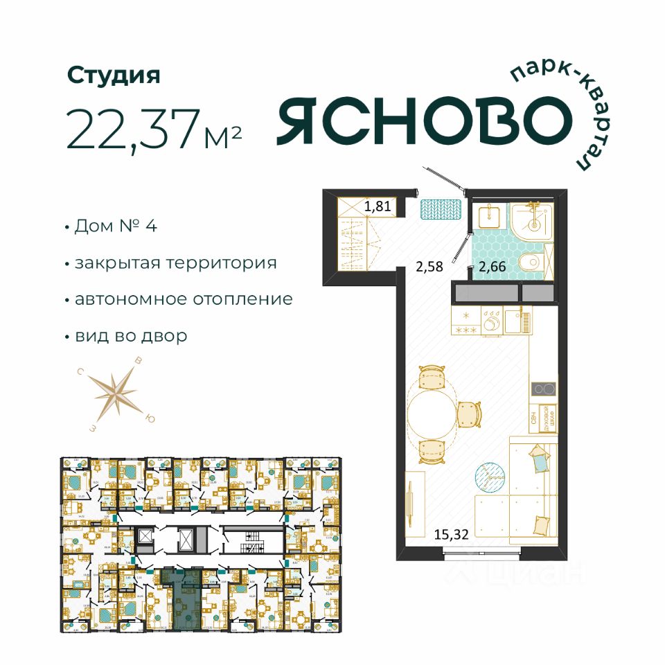 Комфортная квартира во второй очереди парк-квартала Ясново. Квартира сдается в базовой отделке: готова стяжка пола и установлены счетчики, лоджии остеклены и заведен кабель для подключения интернета. Качественные металлические входные двери с надежной фурнитурой. Дополнительно вы можете выбрать любой вид отделки от застройщика — ''whitе bох'' или ''whitе bох PRO'' с полностью готовым санузлом, а также ''под ключ'' в стиле Утро или Вечер.