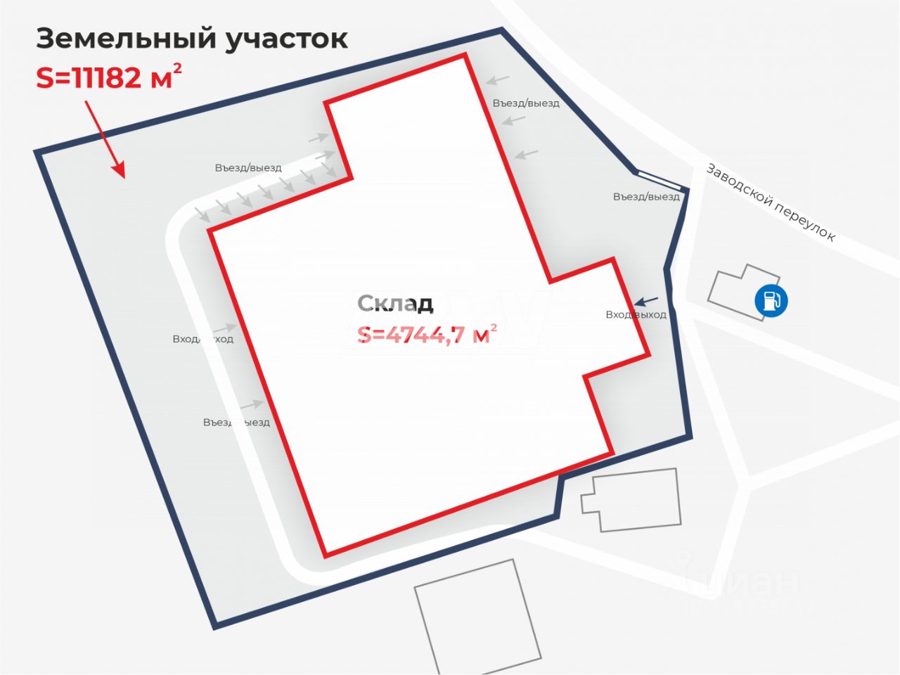 Характеристики объекта: Электрическая мощность объекта 220 В + 380 В мощностью 150 кВт Склад S=4744,7 кв.м Ворота распашные 4,2 *4,0 м - 3 шт., Ворота распашные 4,0 *3,0 м - 4 шт., Ворота распашные 3,0*3,0 м - 8 шт. Отопление в АБК площадью 300 кв.м Высота потолка: 7,3 м. Помещения для персонала АБК S=300 кв.м Водоснабжение и водоотведение локальные (скважина, септик)