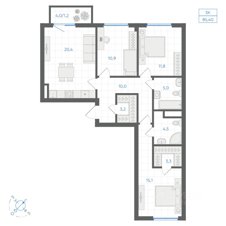 Общая площадь85,4 м2
