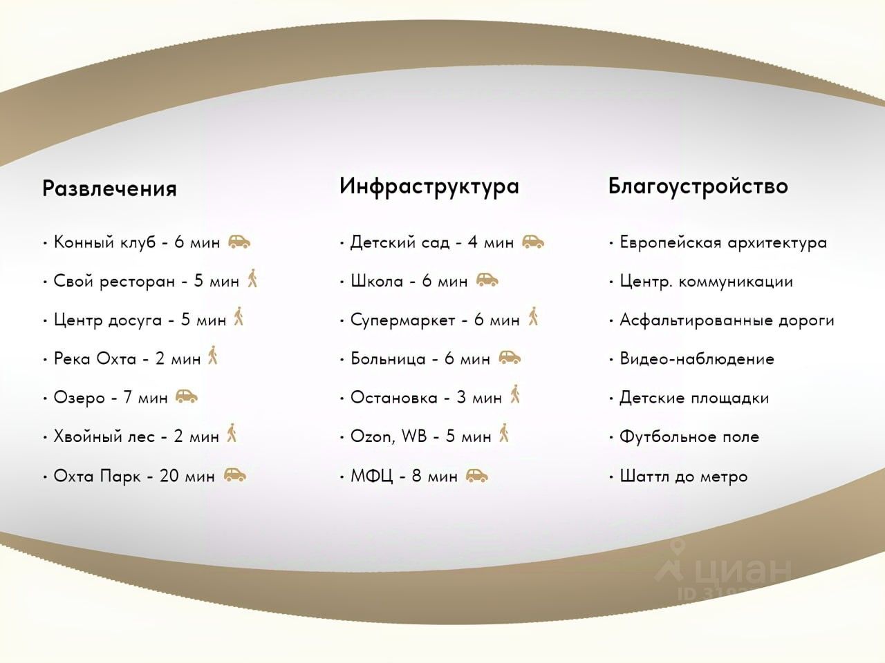 Сочетание городской инфраструктуры, природного окружения и высокого уровня безопасности: Посёлок обустроен для жизни и отдыха: игровые и спортивные зоны, шаттл до метро, магазины и школы рядом, охрана 24/7. Здесь легко почувствовать себя дома!