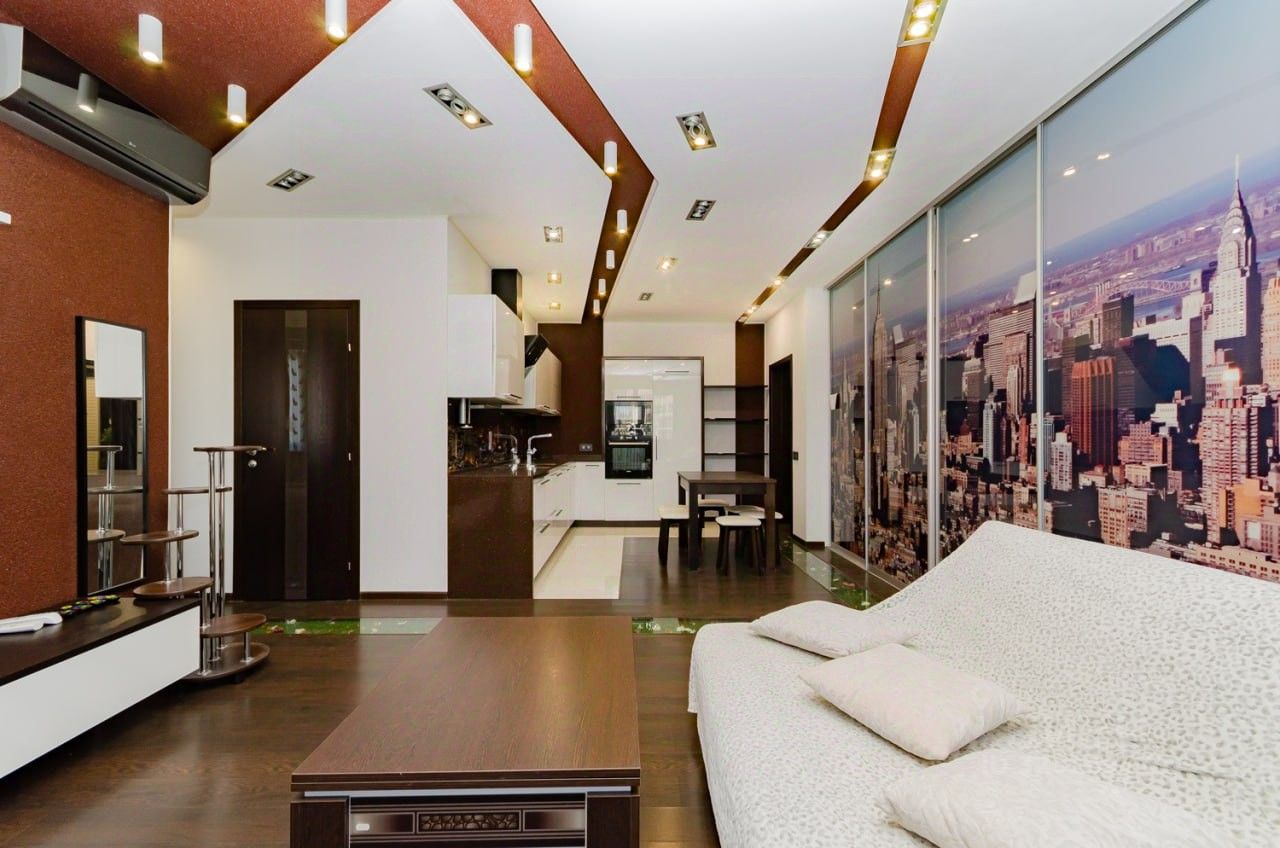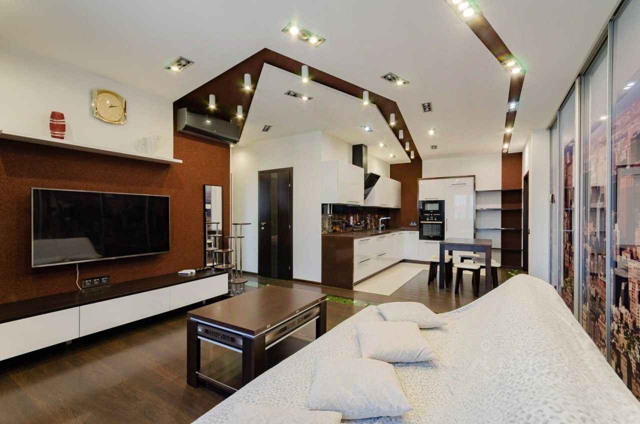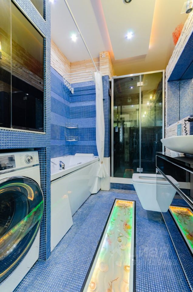 Освещение в квартире обеспечивается большим количеством люстр и светильников. По всему периметру стен, потолков и пола проведена система подсветки, которая придаёт помещению невероятную атмосферу и уют.