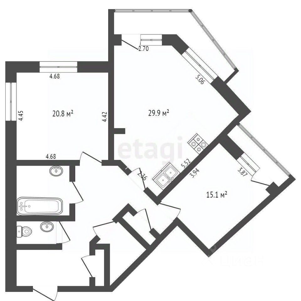 Раздельный санузел и ванная комната с зоной хранения позволят вам организовать пространство так, как вам удобно. На кухне-гостиной остается стильный кухонный гарнитур и встроенная техника, что позволит вам сразу же начать готовить любимые блюда. А большой эркерный балкон станет идеальным местом для утреннего кофе или вечернего отдыха.