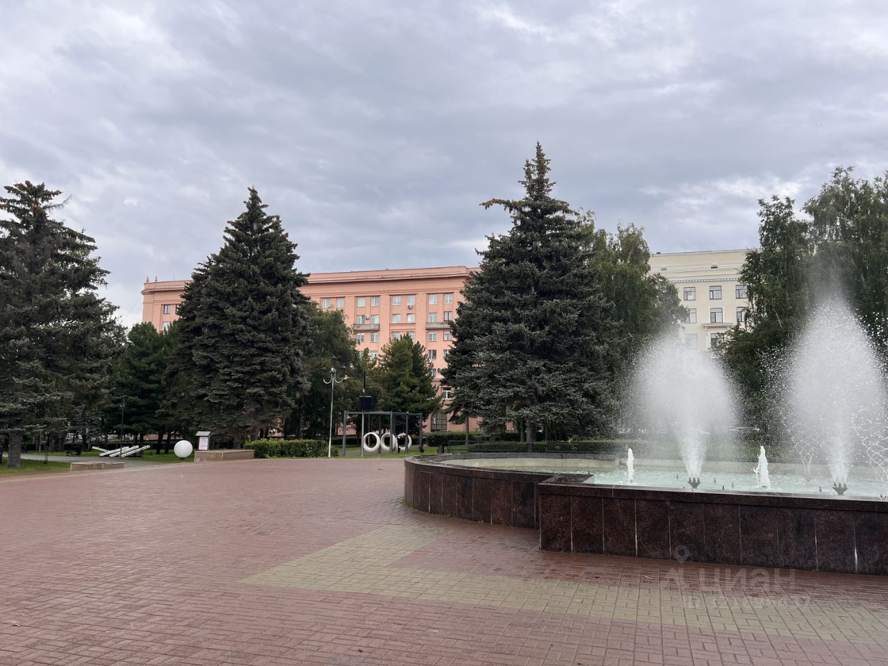 Напротив дома большой сквер с фонтаном.
