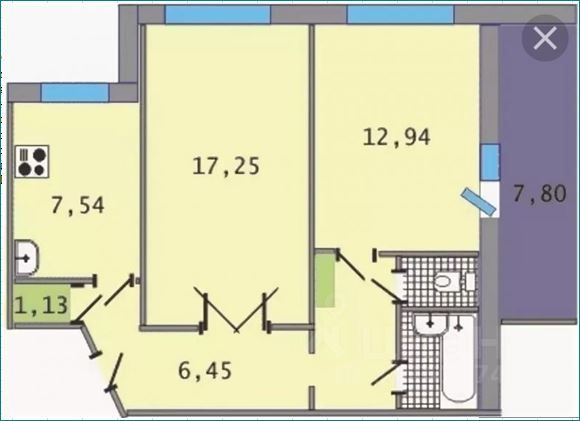Характеристики: • Площадь: 52,8 м² • Жилая площадь: 30,19 м² • Кухня: 7,54 м² • Площадь комнат: 17,25 м² и 12,94 м² • Потолки: 2,6 м • Этаж: 3 из 9 • Большая лоджия: застеклена • Окна: выходят во двор и на улицу • Санузел: раздельный • Связь: телефон, интернет