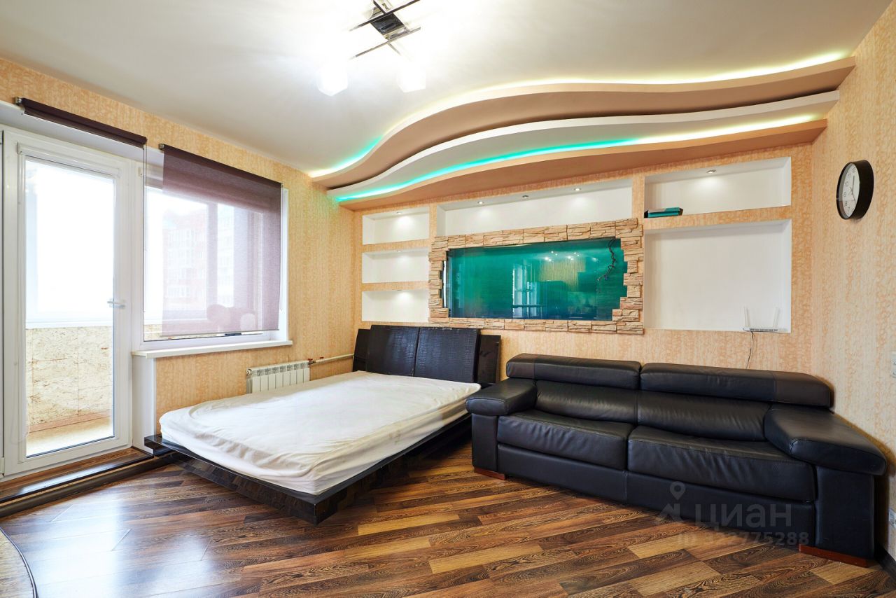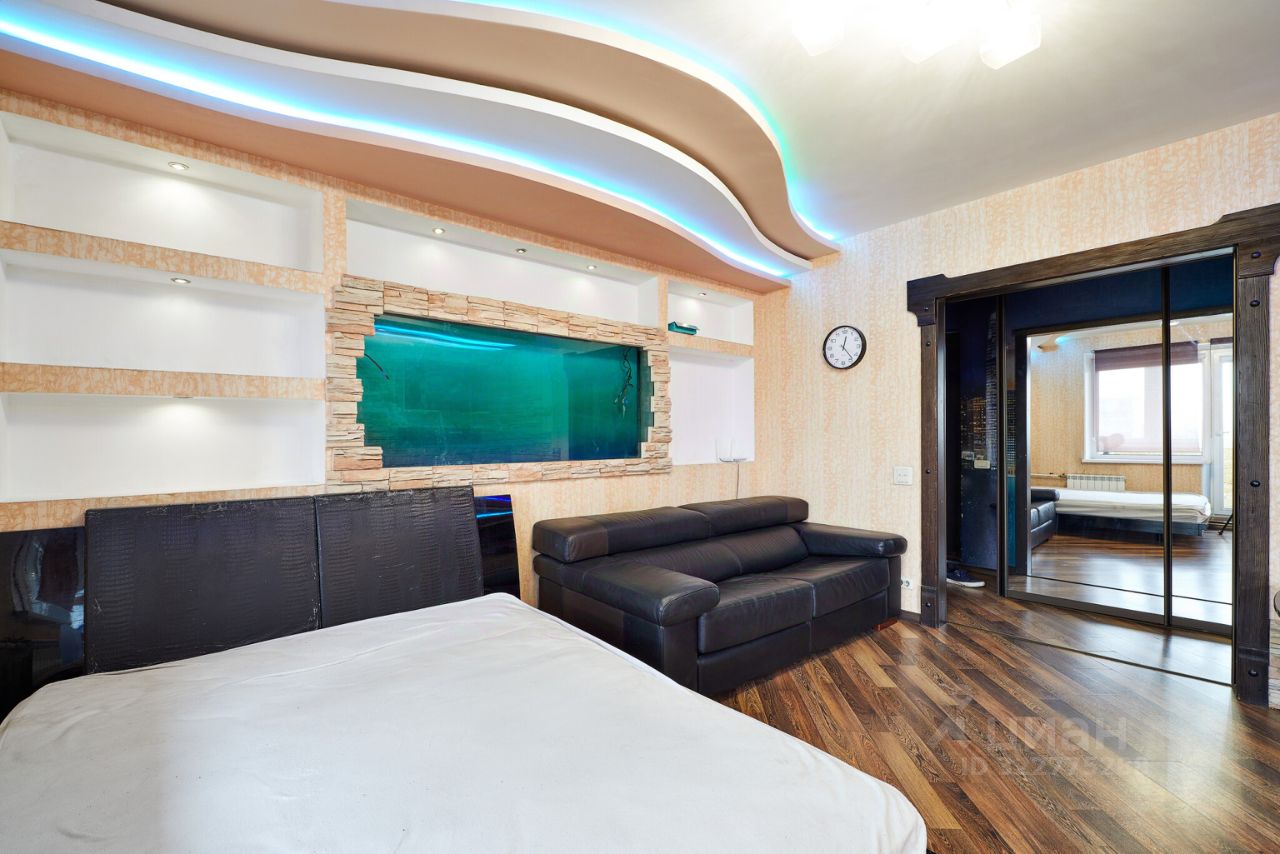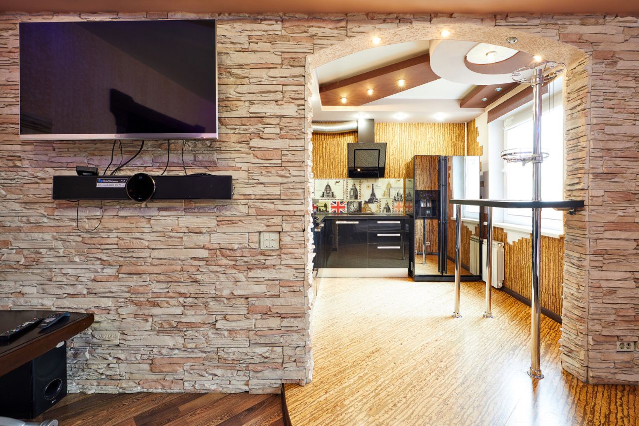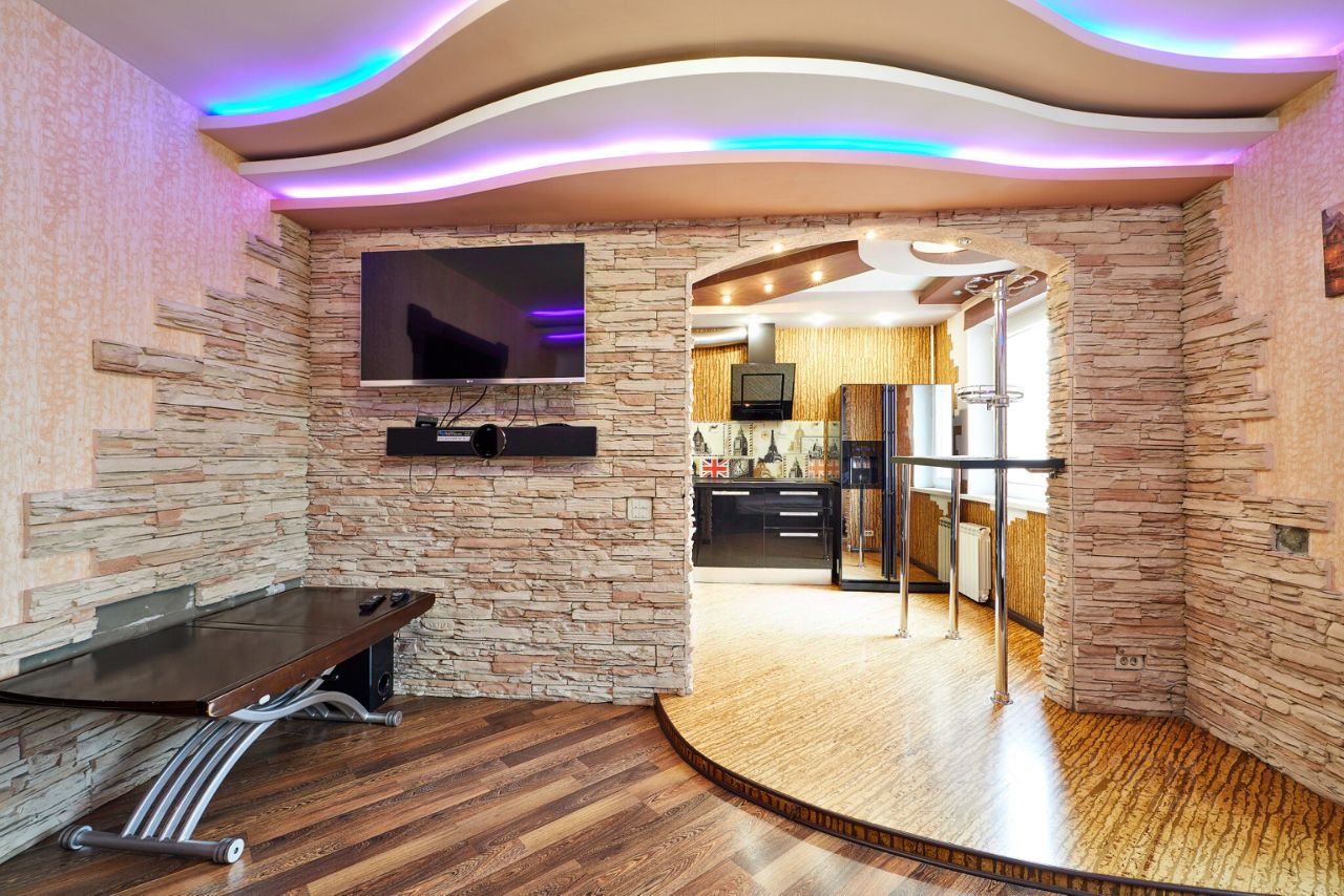 Стены основной комнаты облицованы декоративным камнем, на кухню сделан безбарьерный вход. В спальной комнате установлена вся мебель и техника - кожаный диван, кровать, стол раздвижной , телевизор, домашний кинотеатр. В центре стены создана полость под аквариум, которая уже закрыта стеклом и выведено электричество. Потолок с динамическим освещением в несколько уровней, установлена так же люстра.