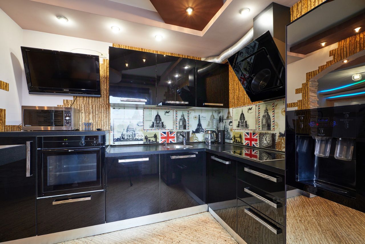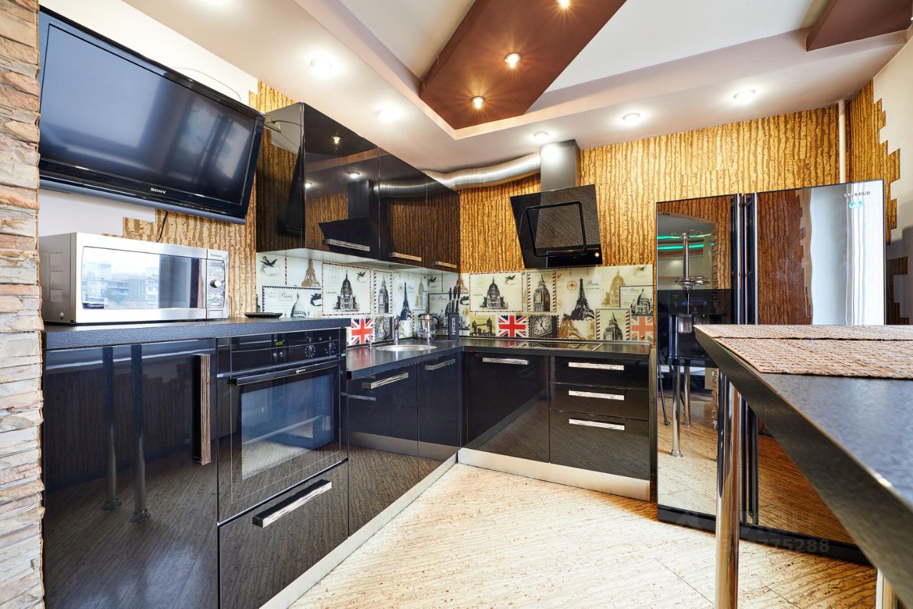 Кухонная зона имеет не тривиальное цветовое решение, черный кухонный гарнитур высокого класса, холодильник Samsung с большой морозильной камерой и функцией подачи льда, варочная панель, вытяжка, духовая печь, посудомойка. В целях экономии пространства установлена стильная барная стойка.