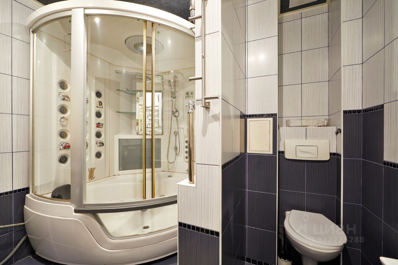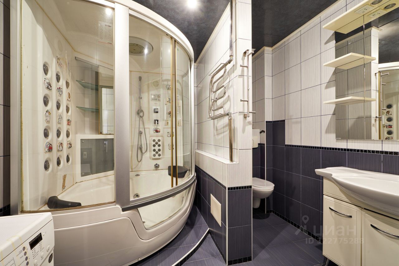 Сан.узел совмещен, установлена душевая кабина с большим количеством функций, в том числе массаж и подсветка, так же ее можно использовать как ванную. Туалет подвесной, со скрытым баком, раковина с тумбой, зеркалом и зонами размещения предметов гигиены или моющих средств. Так же есть стиральная машина и установлена функция ''теплый пол''.