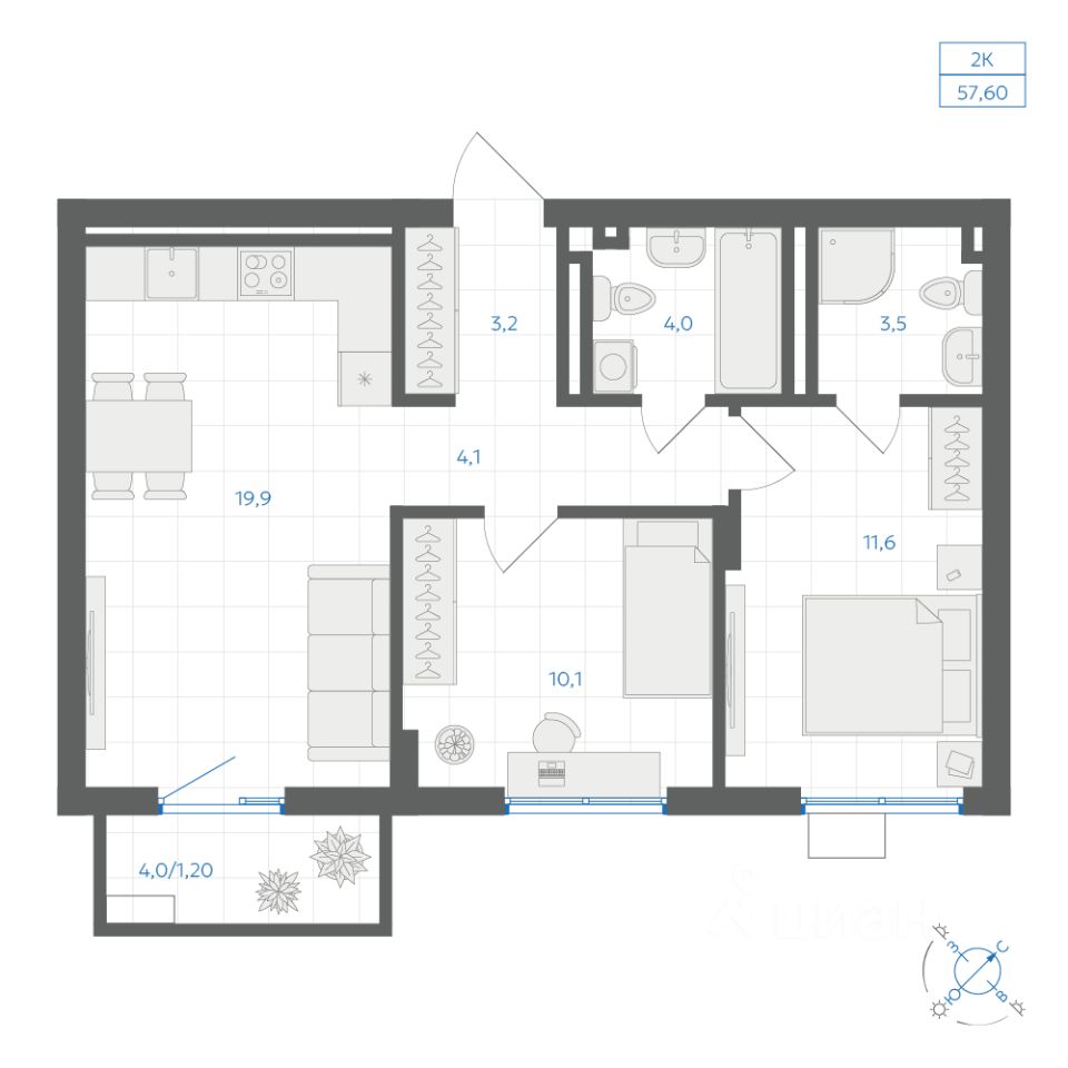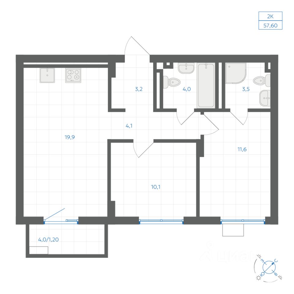Общая площадь57,6 м2