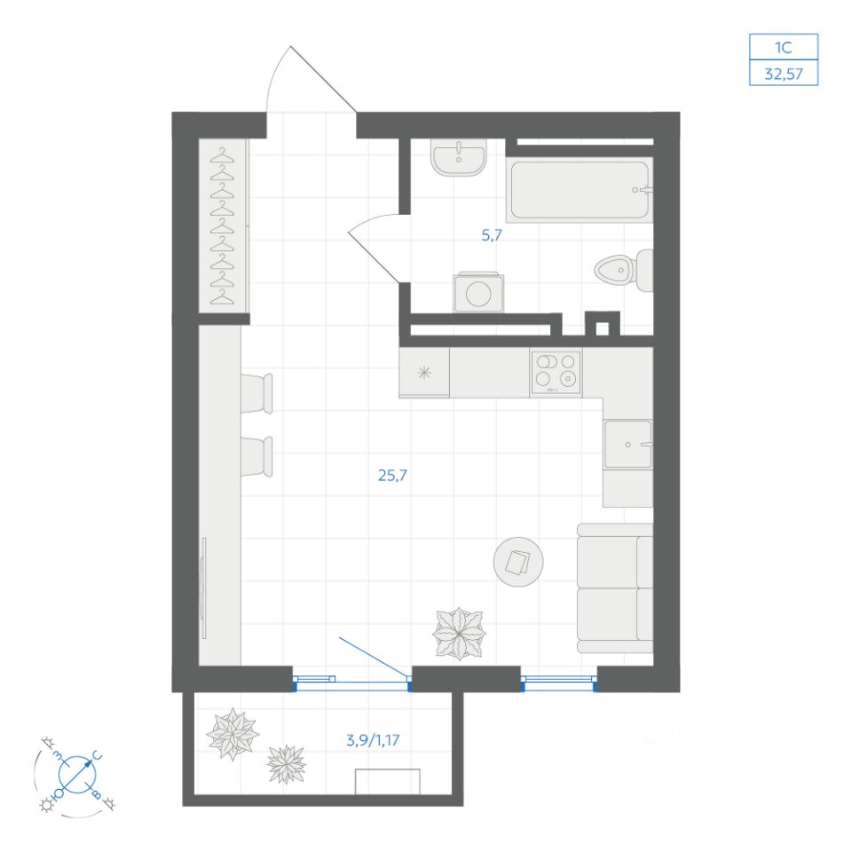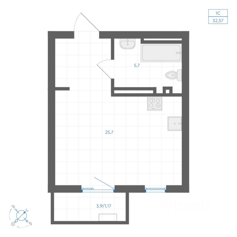 Общая площадь32,57 м2