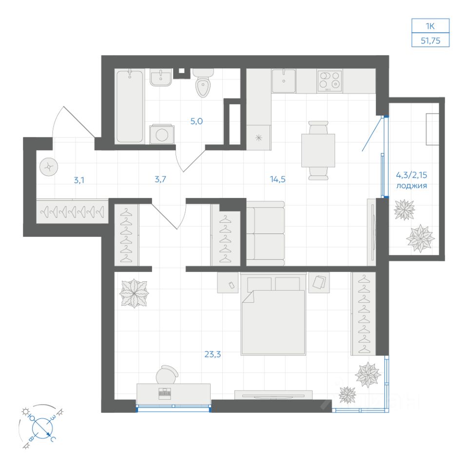 Общая площадь51,75 м2