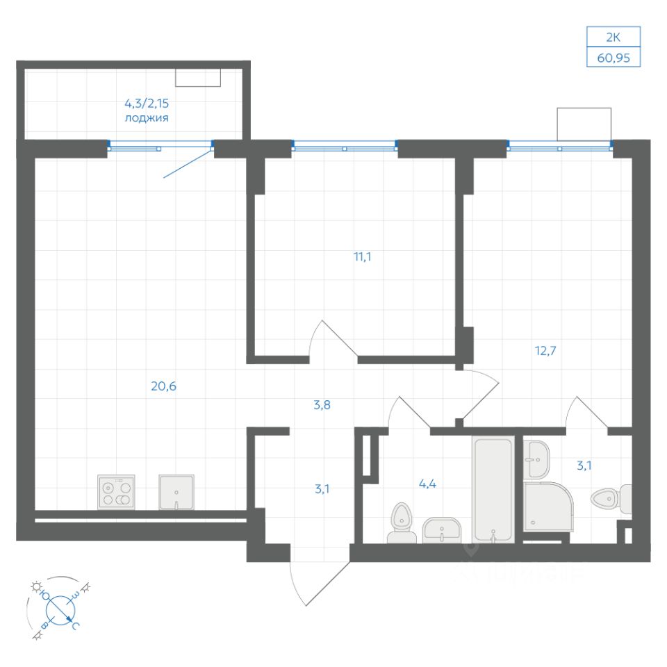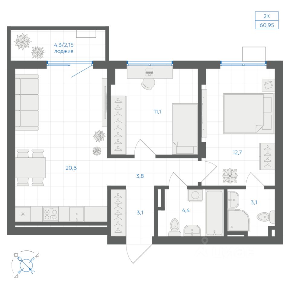 Общая площадь60,95 м2