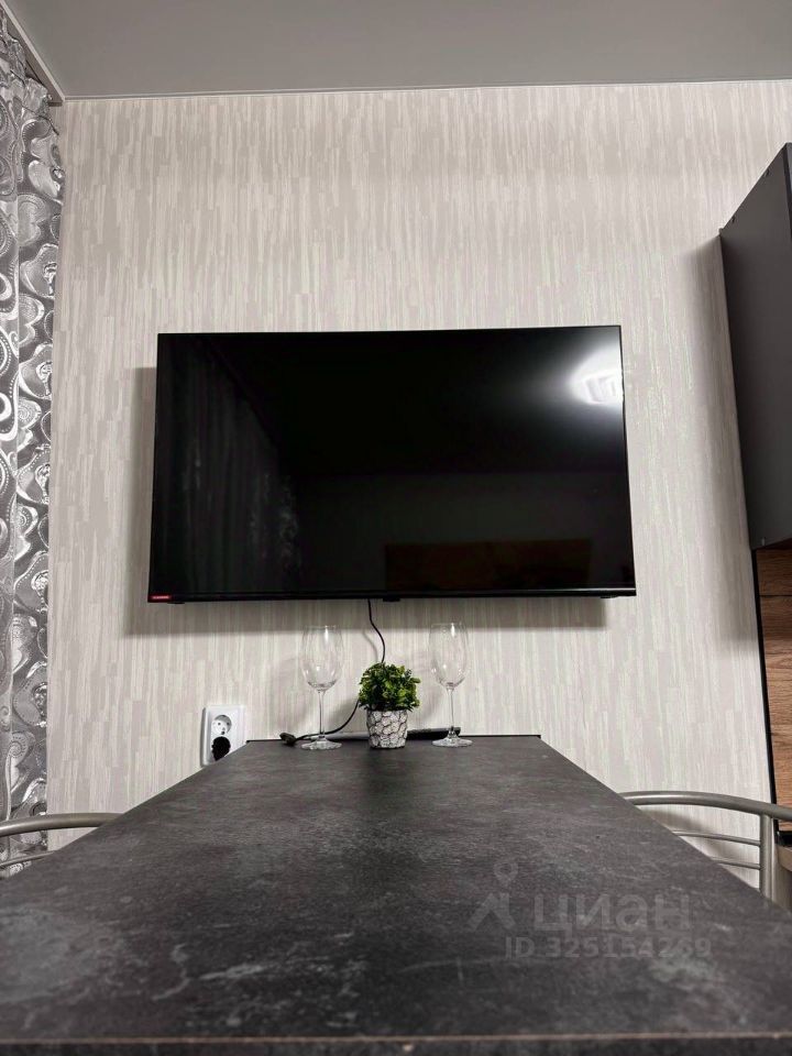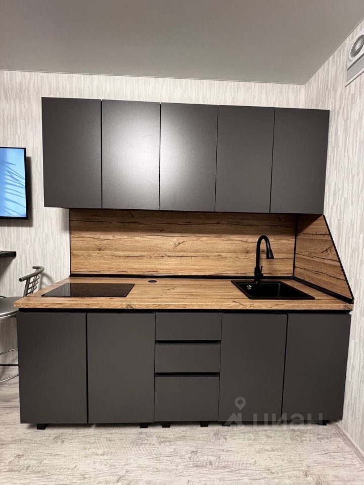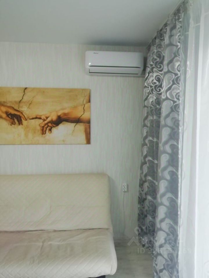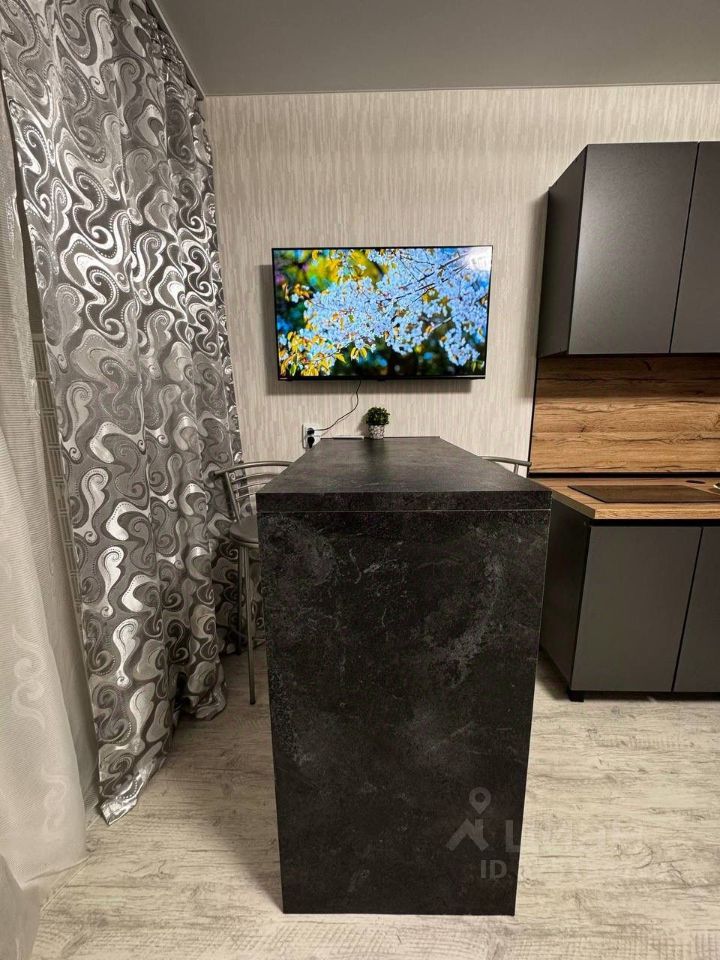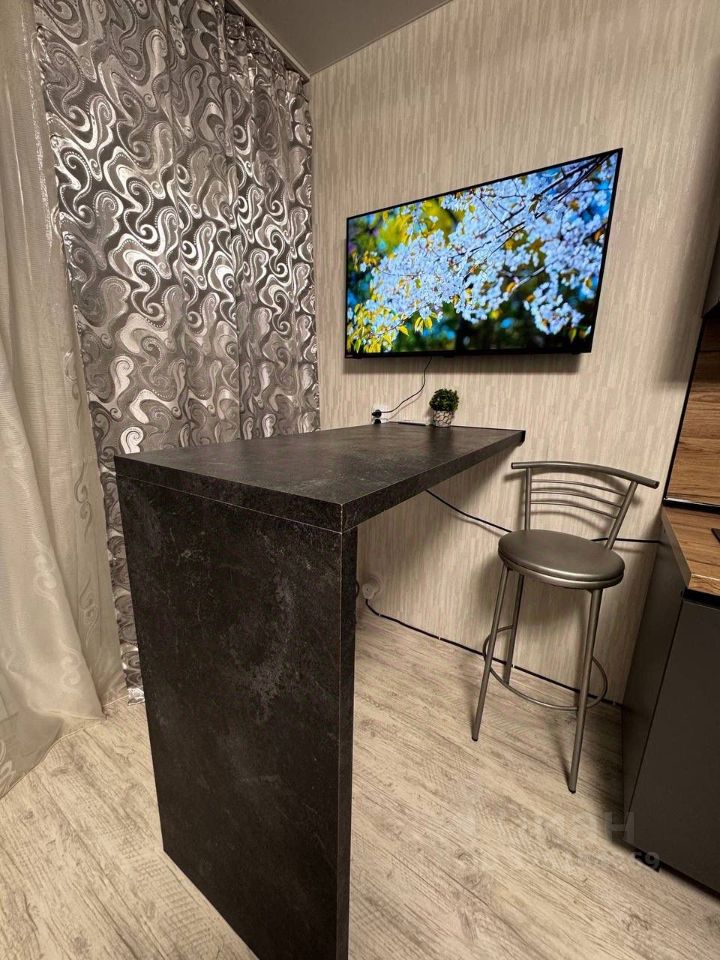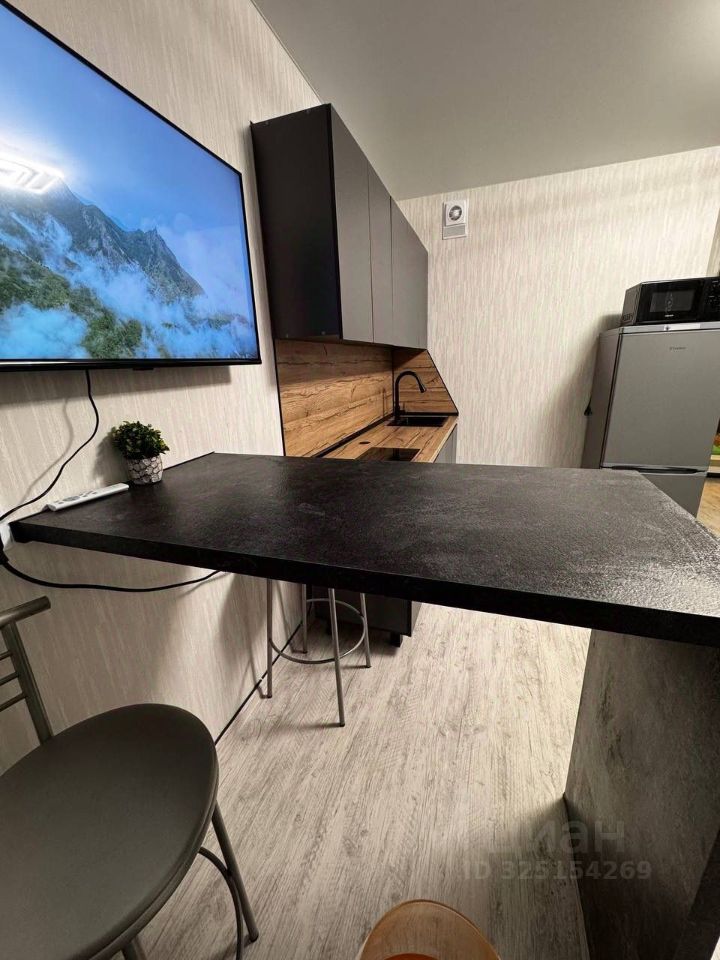 Студия полностью готова к проживанию: в комнате и на кухне есть вся необходимая мебель и посуда. Из техники — кондиционер, холодильник, микроволновка, чайник, телевизор и стиральная машина.