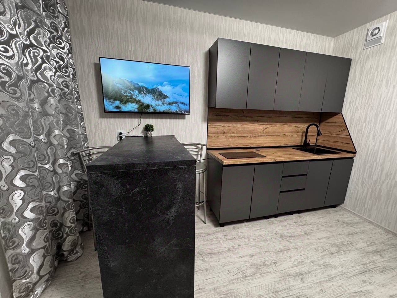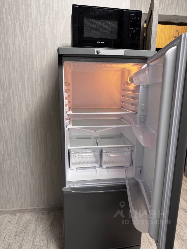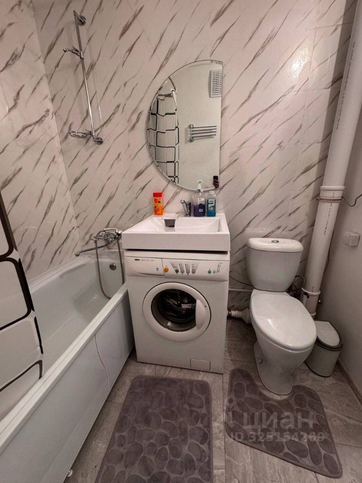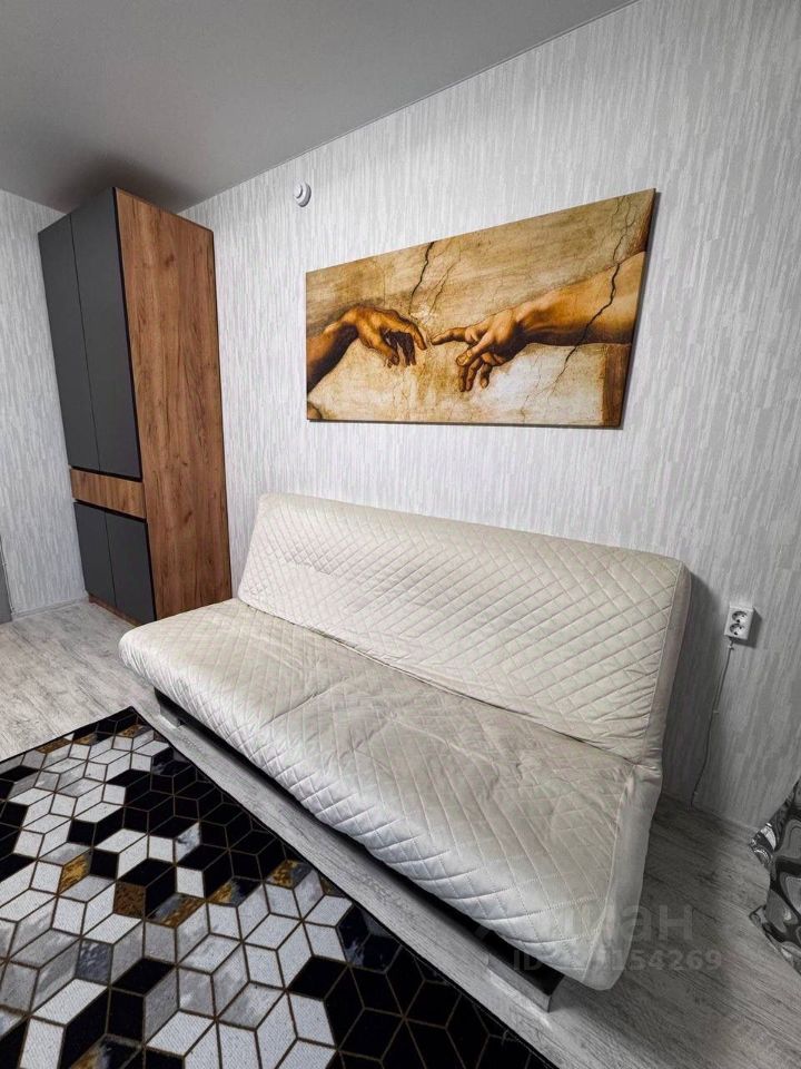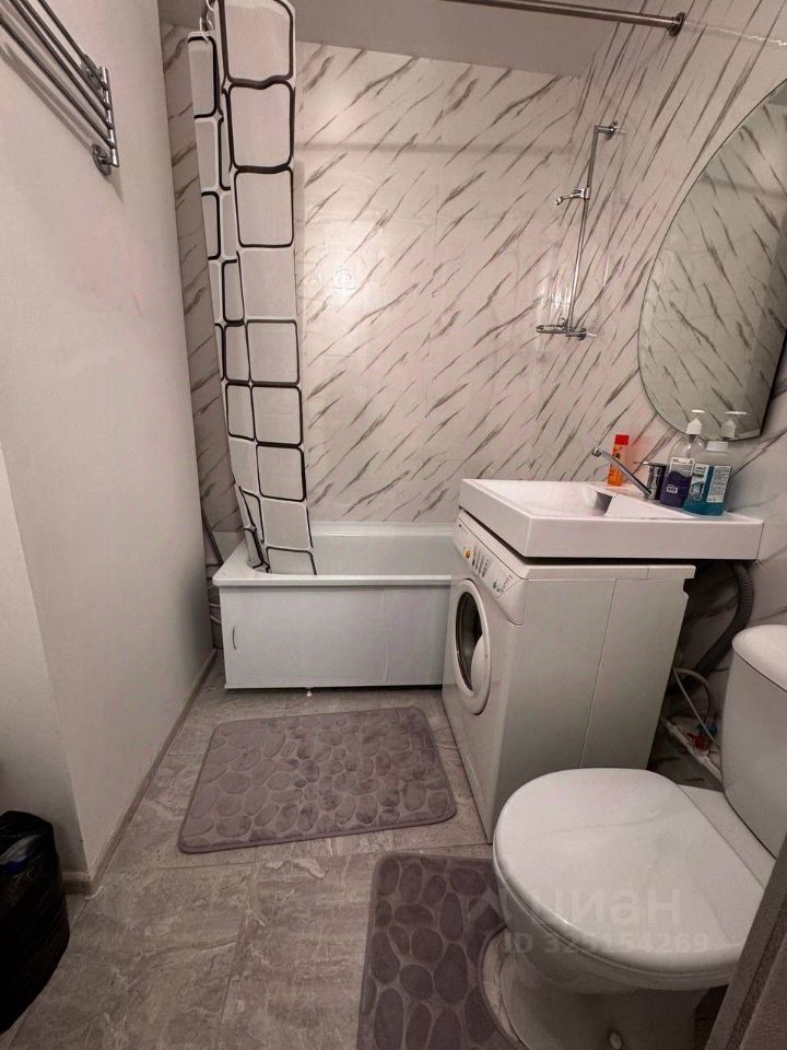 Студия полностью готова к проживанию: в комнате и на кухне есть вся необходимая мебель и посуда. Из техники — кондиционер, холодильник, микроволновка, чайник, телевизор и стиральная машина.