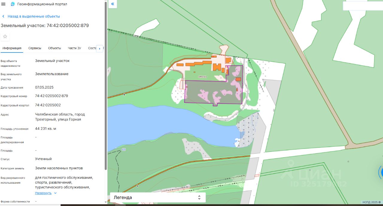 Данные получены с сайта ГИС Торги. Земельный участок с кадастровым номером 74:42:0205002:879 площадь 44231 по адресу Челябинская область, город Трехгорный, улица Горная