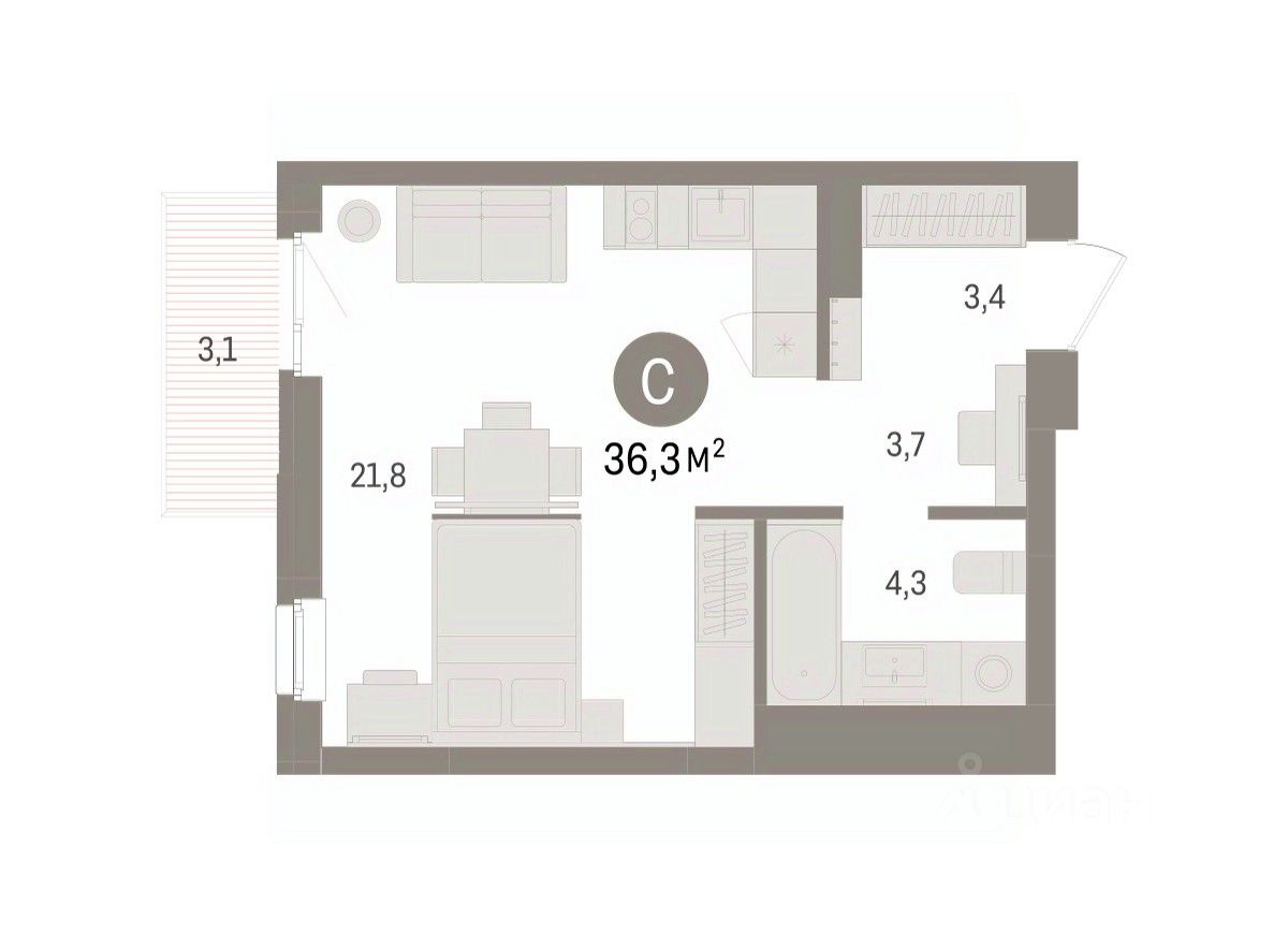Студия в Брусника в Эльтауне. Особенности планировки: балкон. квартиры в нашей базе: ЛТН01.1-Ж2.3.8.