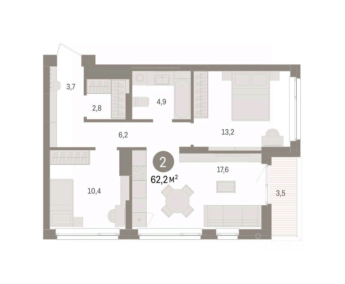 Квартира с кухней-гостиной и двумя спальнями в Брусника в Эльтауне. Особенности планировки: разнесённые спальни. квартиры в нашей базе: ЛТН01.1-Ж1.2.4.