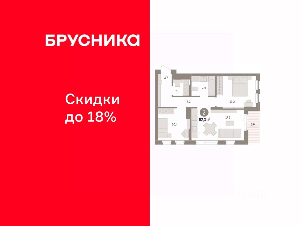 Квартира с кухней-гостиной и двумя спальнями в Брусника в Эльтауне. Особенности планировки: вид во двор, гардеробная, лоджия, разнесённые спальни. квартиры в нашей базе: ЛТН01.1-Ж4.6.4.