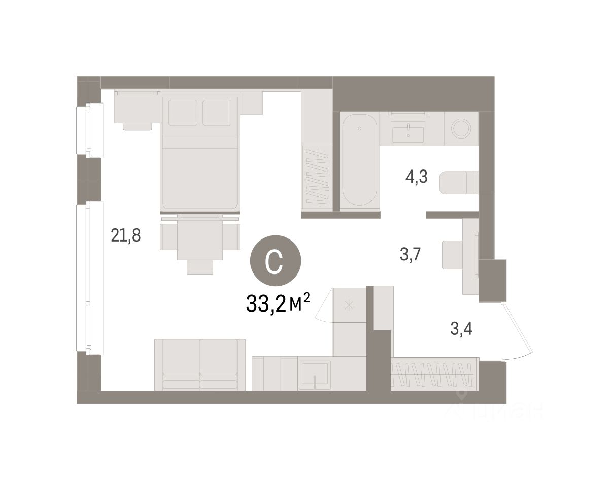 1-комн. студия с предчистовой отделкой в ЖК ''Брусника в Эльтауне'' на 2 этаже. Общая площадь: 33.17 кв.м., площадь гостиной 21.8 кв.м., из которых 5 кв.м. выделено под кухонную зону. Все окна выходят на одну сторону. В квартире один совмещенный санузел. Высота потолков 2.7 м.