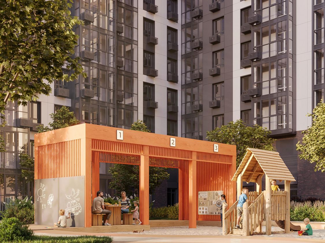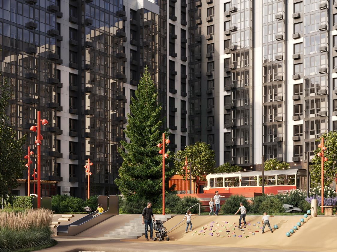 •Двор без машин •Закрытая территория •Ландшафтный дизайн и озеленение •Зона с зарядными устройствами во дворе •Антимоскитные фонари на территории двора •Зона отдыха и релакса для взрослых •Архитектурная подсветка фасадов •Детские площадки для всех возрастов и разных игровых сценариев