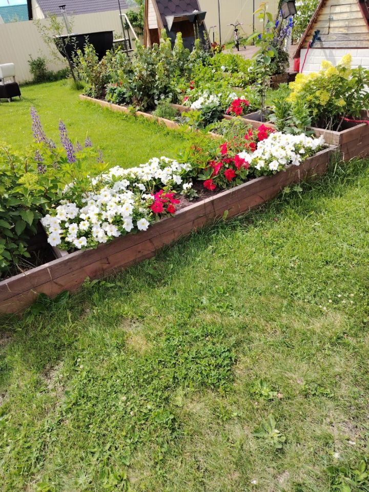Насаждения: - две Голубые ели по 1.2 метра, - Туи 6 штук, находятся вдоль забора, отсыпаны декорированным мраморным щебнем, - две груши (4 года), - яблоня (3 года), - слива, - черешню посадили в этом году, хорошо взялась, посмотрим как перезимует, - малина - три зоны, - цветники общей длинной более 30 метров, - 5 кустов Гортензия (4 года ), - три высоких грядки для посадки овощей и зелени.