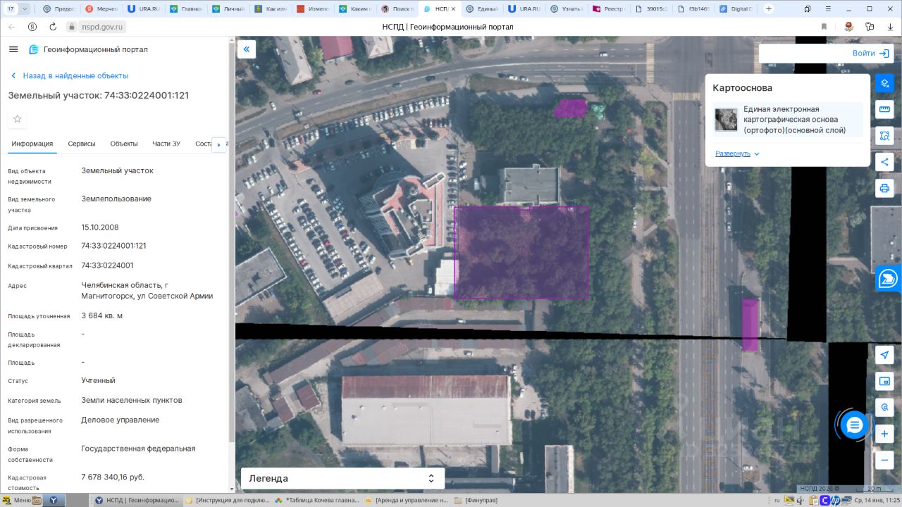 Лот 1 Земельный участок, расположенный по адресу: Челябинская область, г. Магнитогорск, ул. Советской Армии, -номер РНФИ: П11740002968, -кадастровый номер 74:33:0224001:121, -общей площадью: 3 684 кв. м, -категория земель: земли населенных пунктов