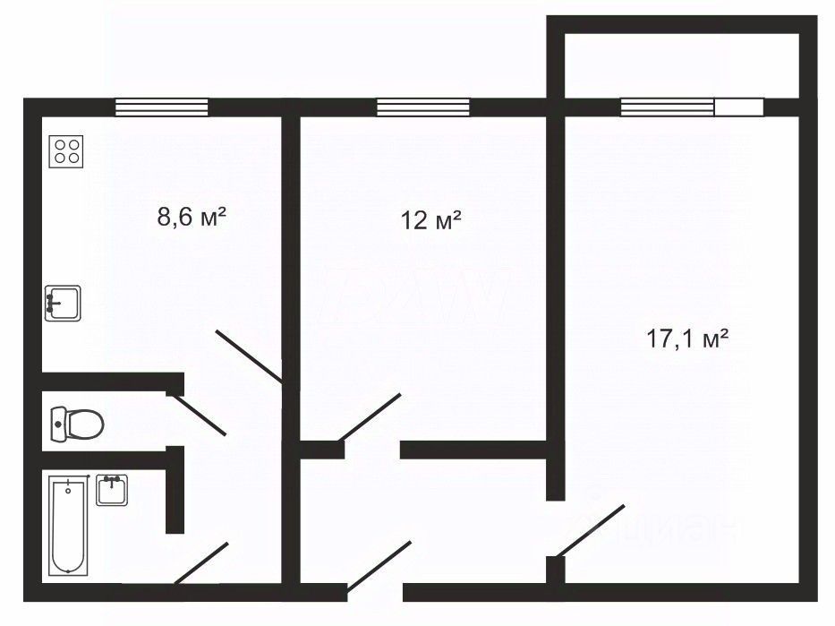 Планировка: Квартира в доме 121 серии, состоит из 2-х комнат 12 и 17 м² с выходом на застекленную лоджию и отдельной кухни - 8,6 м².