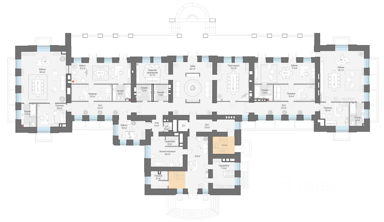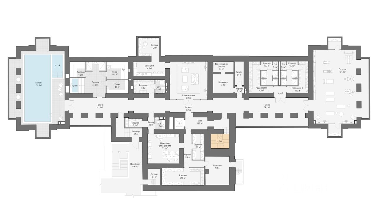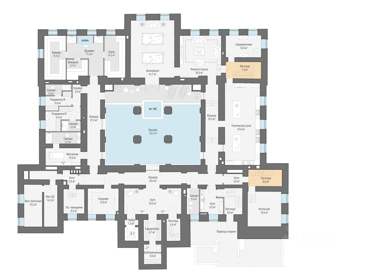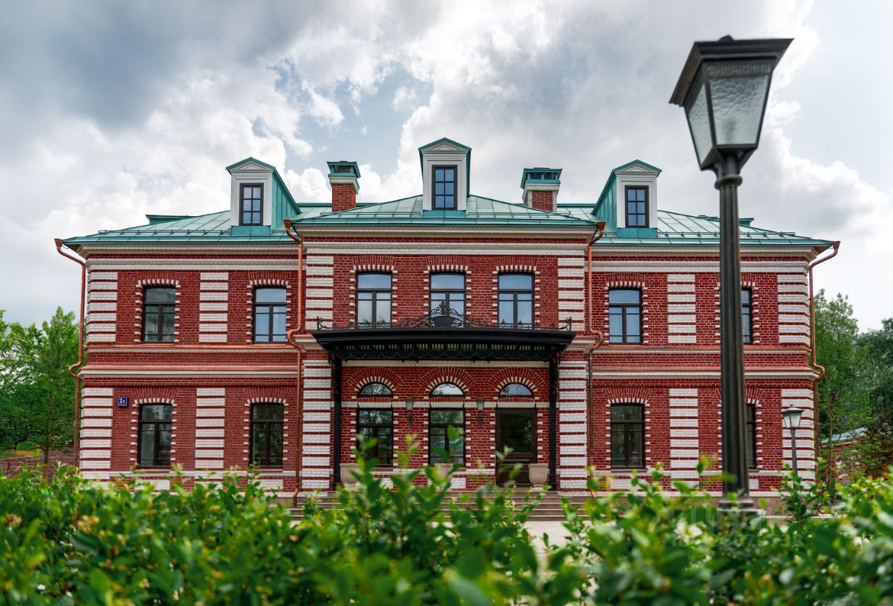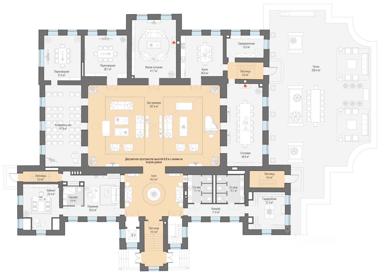 Дом приёмов - 1 218 м² • 2 этажа, в том числе цокольный • Потолки 8,8 метров • Парадный зал площадью 175 м² • Два дровяных камина • Конференц-зал площадью 46 м2, переговорные и VIP-кабинет с отдельным входом • Бассейн со спа-зоной • Техническая кухня, подъёмник и сервировочная комната • Парадные и служебные входы
