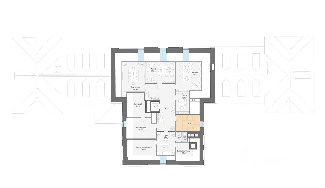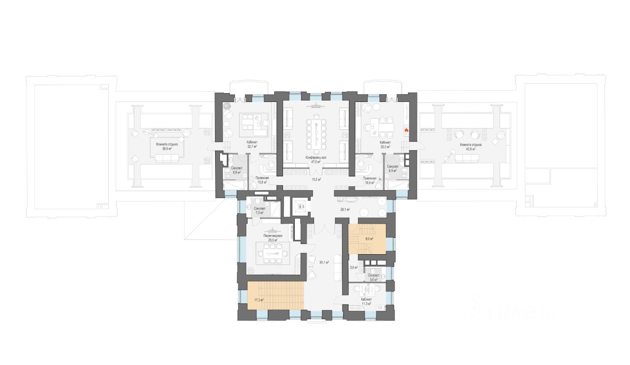 Главная резиденция - 2 218 м² • 4 этажа, в том числе цокольный и мансарда • Потолки до 5,5 метров • Три дровяных камина • Конференц-зал, переговорные, рабочие и VIP-кабинеты, комнаты отдыха • Бассейн со спа-зоной • Просторная терраса с видом на приватный парк • Отдельные входя для руководителей и сотрудников