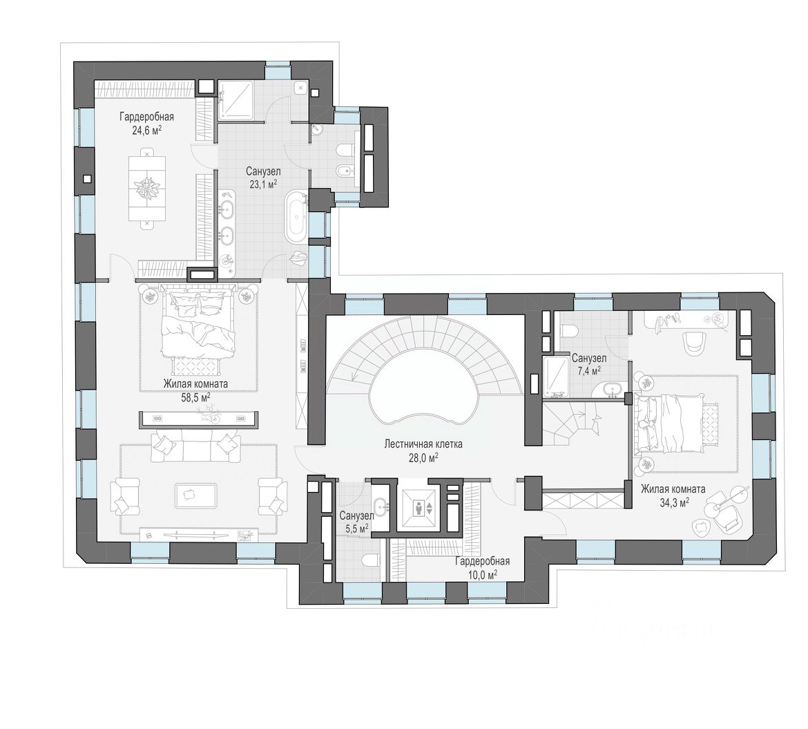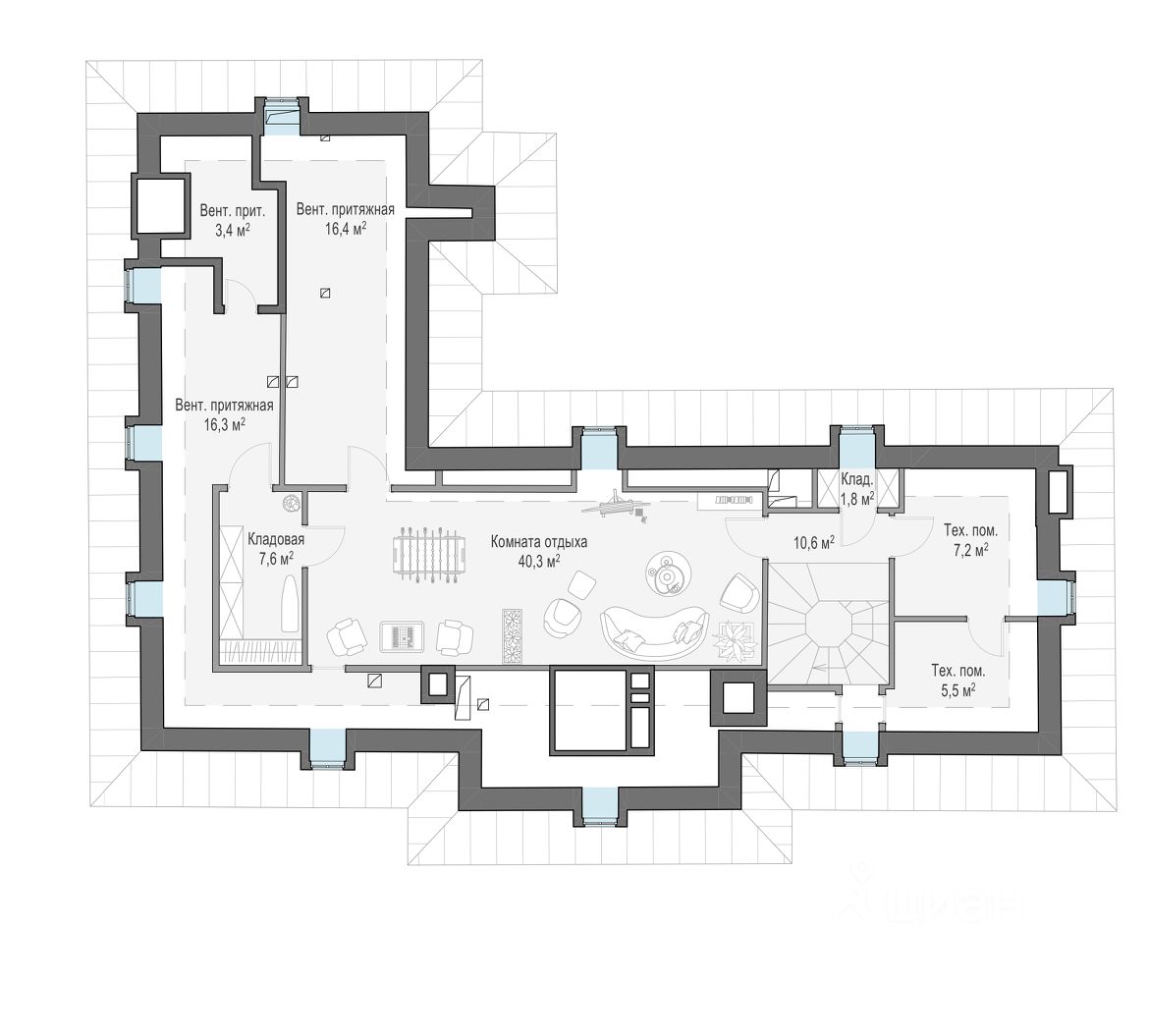 Гостевой дом - 707 м² • 4 этажа, в том числе цокольный и мансарда • Обособленная приватная территория площадью 1300 м², в том числе малый сад. • Комната отдыха с дровяным камином • Спортзал со спа-зоной • Лифт