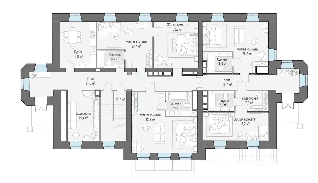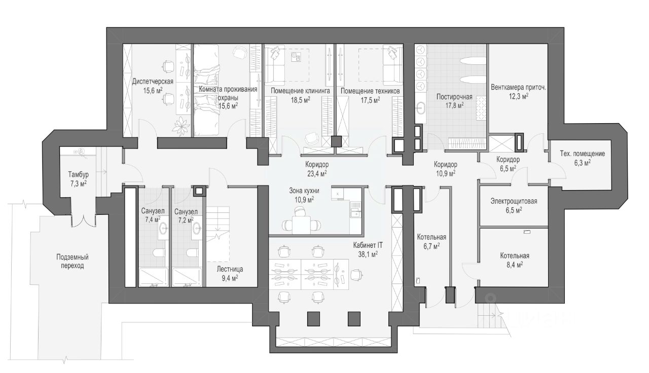 Сервсиный дом - 561 м² • 3 этажа, в том числе цокольный и мансарда • Для сервисных целей, дополнительных рабочих мест и проживания гостей и персонала • Единая диспетчерская для мониторинга и управления всеми системами комфорта и безопасности • Расположен в отдалении от остальных домов