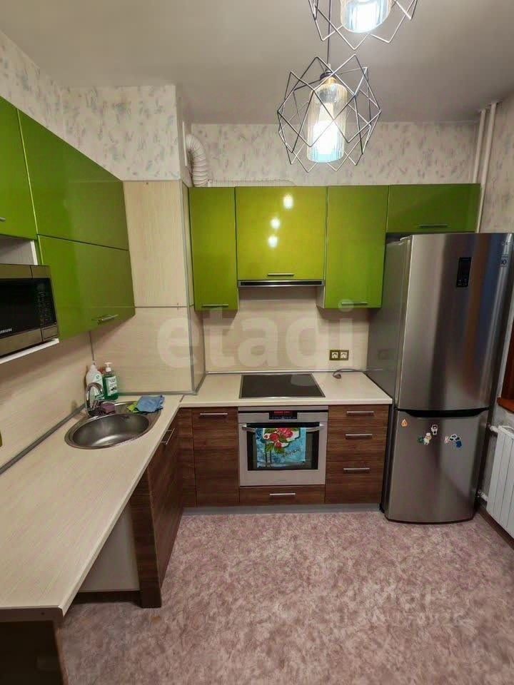 Мебель и техника остаются: кухонный гарнитур, шкаф в комнате, спальные места, холодильник — можно заехать и жить.