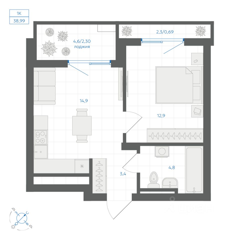 Общая площадь38,93 м2