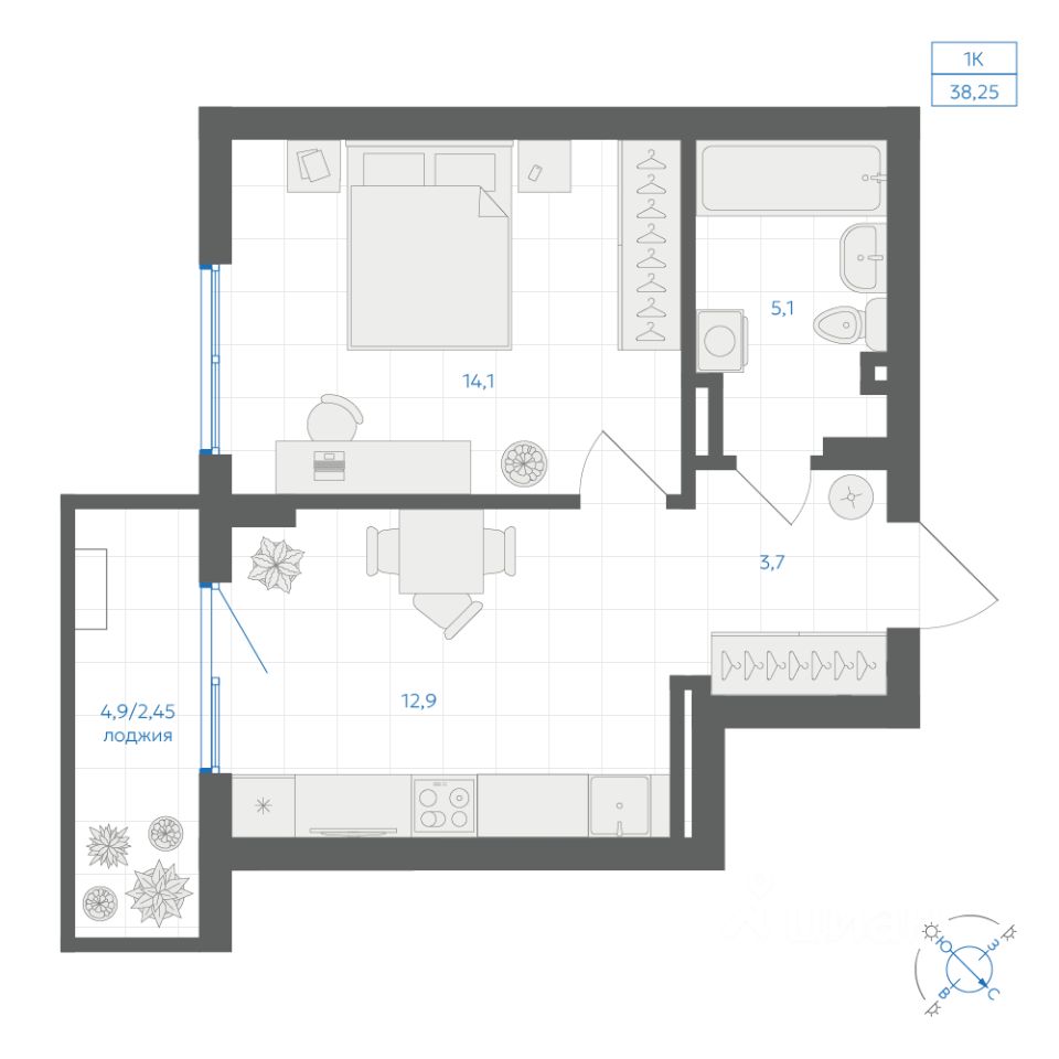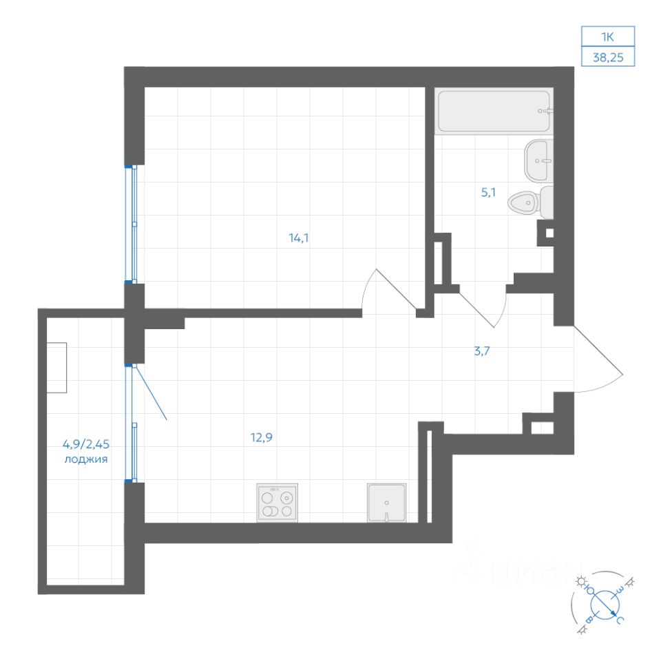 Общая площадь38,25 м2