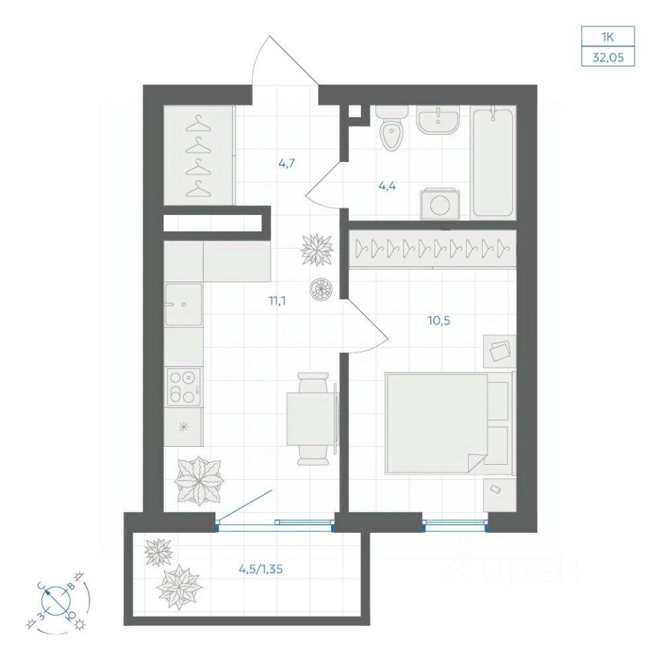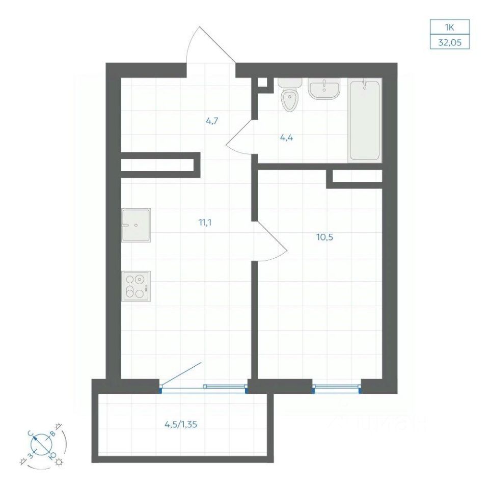 Общая площадь32,05 м2