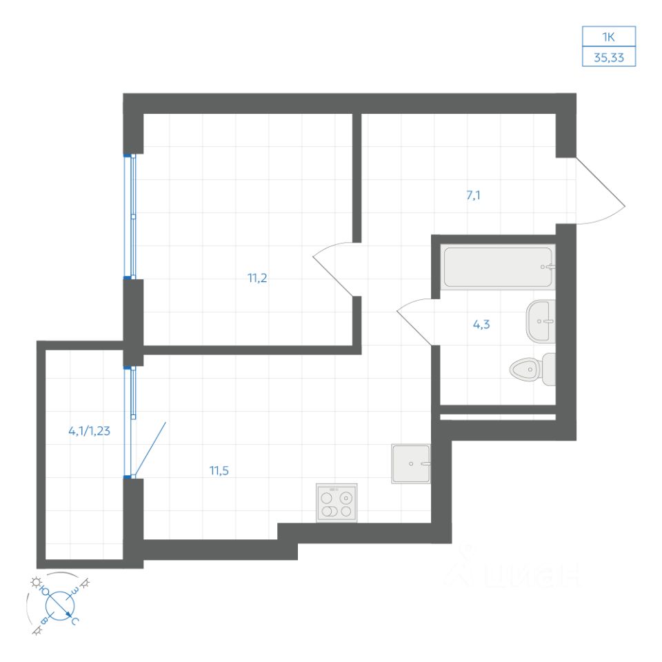 Общая площадь35,33 м2