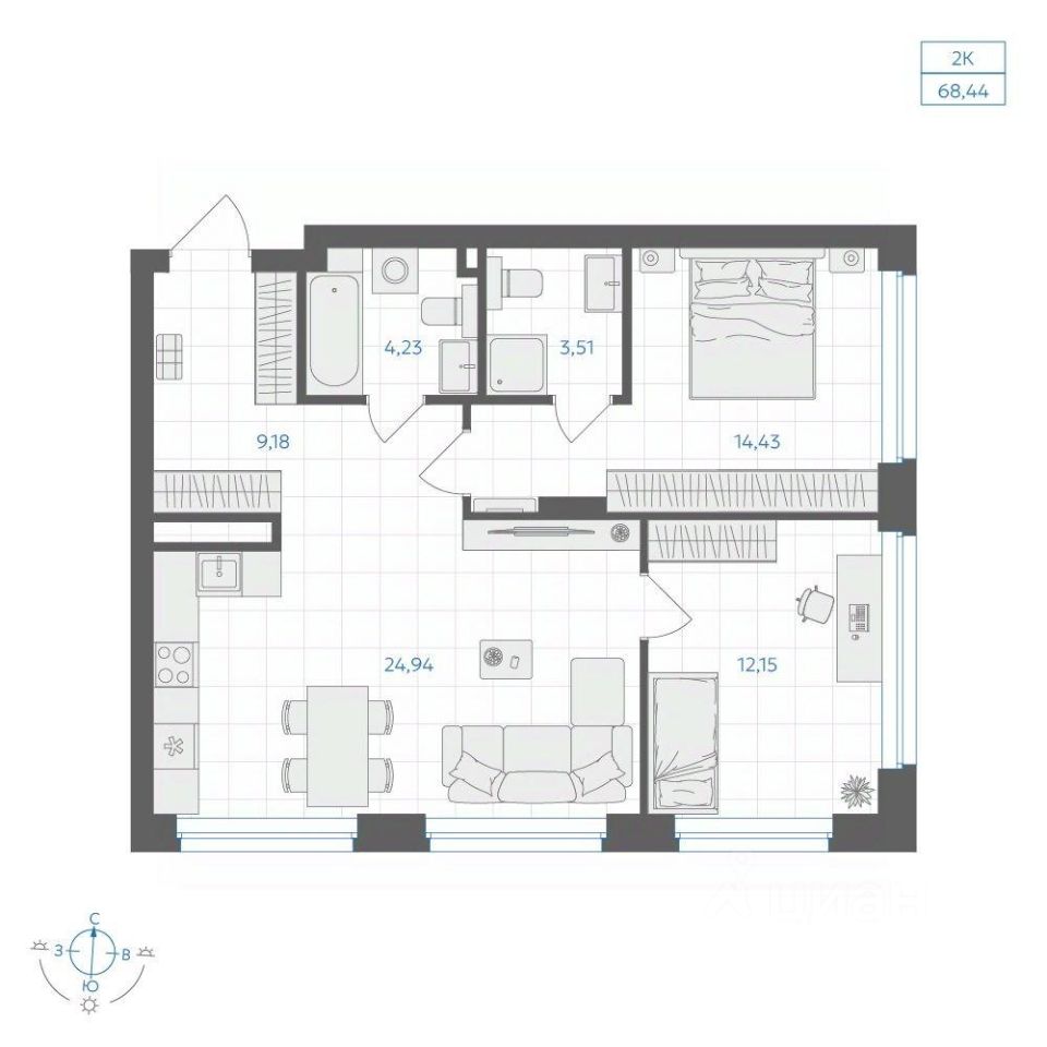 Общая площадь68,44 м2