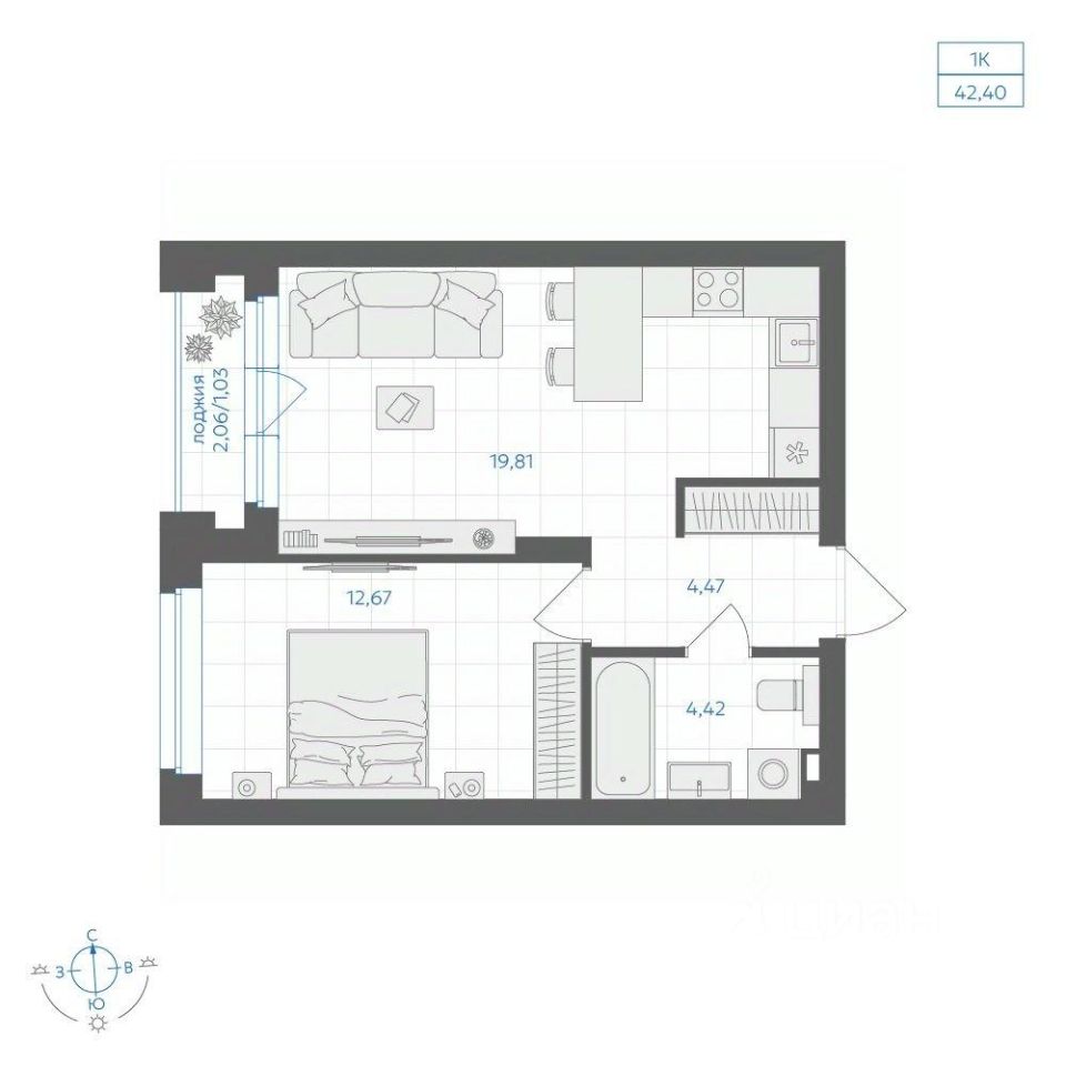 Общая площадь42,4 м2