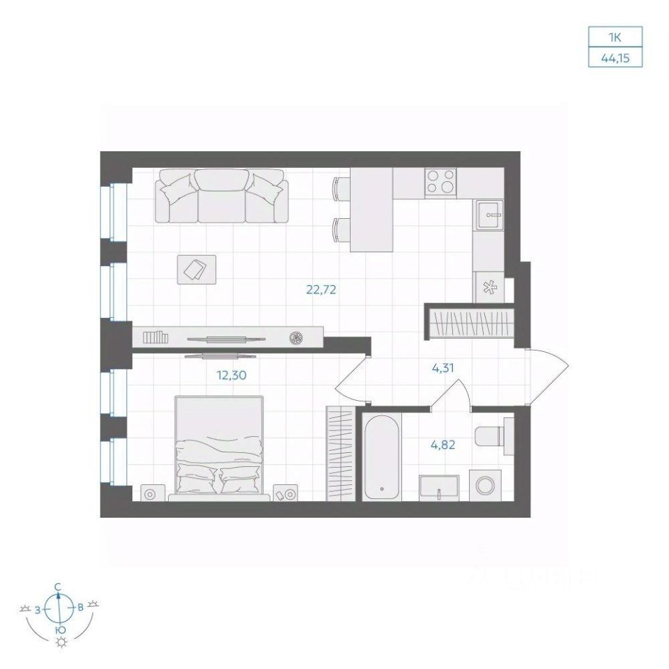 Общая площадь44,15 м2