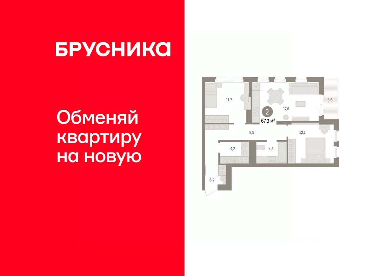 Просторная двухкомнатная квартира с предчистовой отделкой в ЖК ''Брусника в Эльтауне'' на 5 этаже. Общая площадь: 67.27 кв.м. Высота потолков 2.7 м.