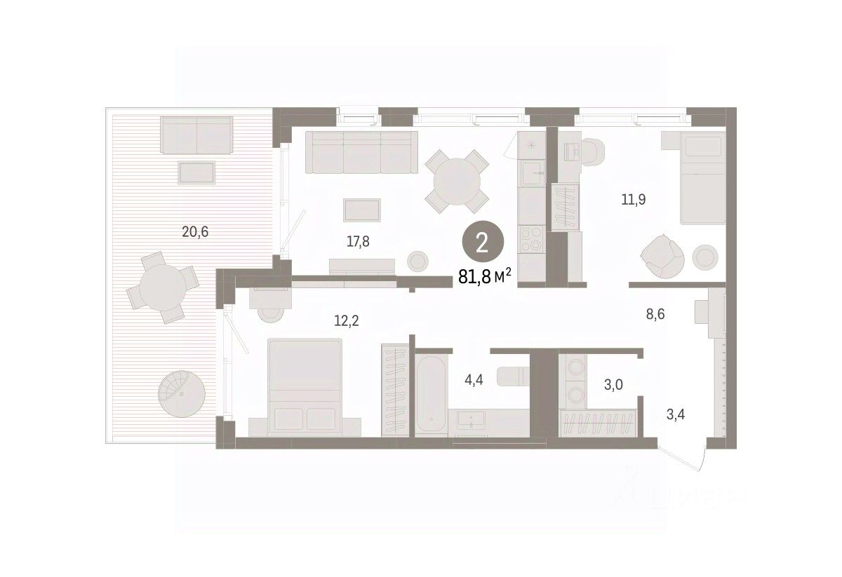 Квартира с кухней-гостиной и двумя спальнями в Брусника в Эльтауне. Особенности планировки: разнесённые спальни. квартиры в нашей базе: ЛТН01.1-Ж3.1.4.