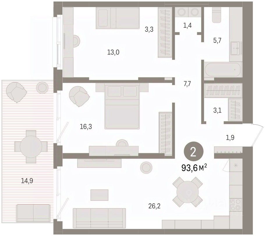 Квартира с кухней-гостиной и двумя спальнями в Брусника в Эльтауне. Особенности планировки: разнесённые спальни. квартиры в нашей базе: ЛТН01.1-Ж1.1.2.