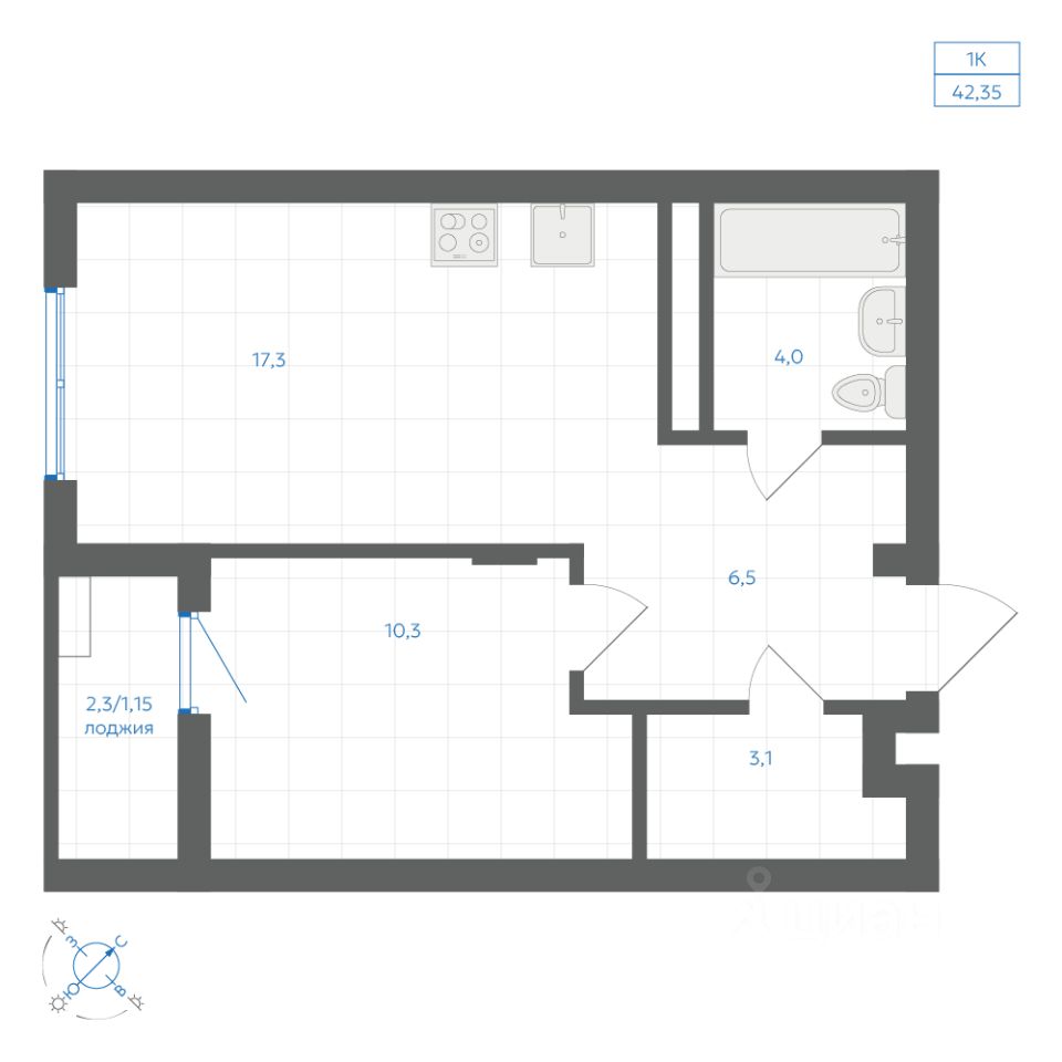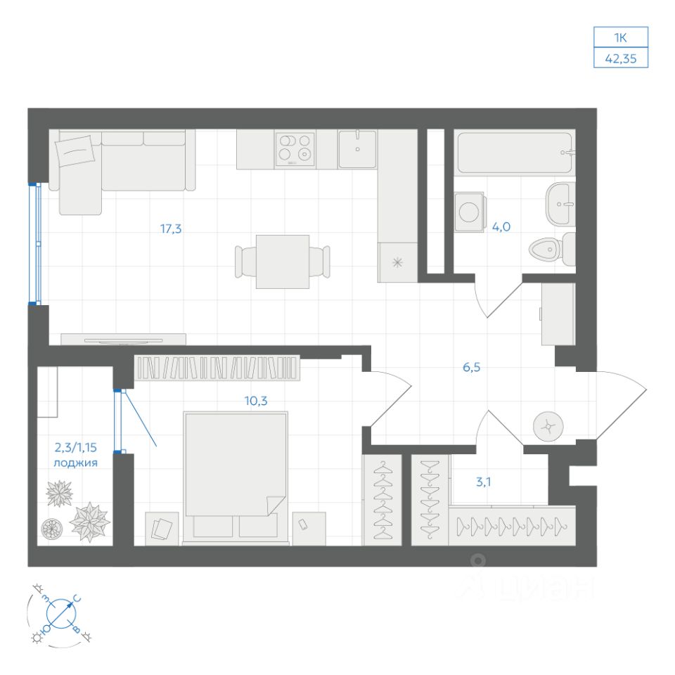 Общая площадь42,35 м2