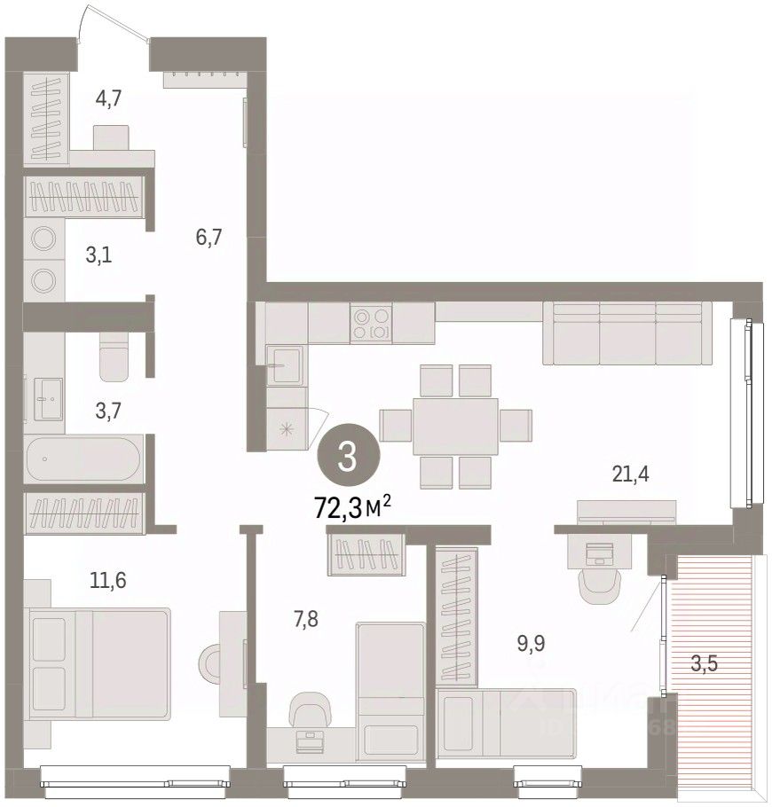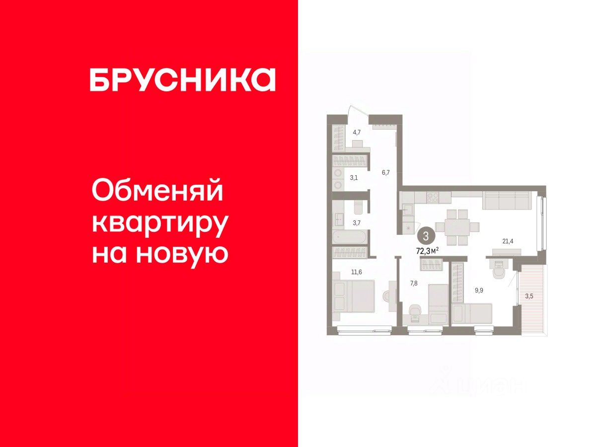 Квартира с кухней-гостиной и тремя спальнями в Брусника в Эльтауне. Особенности планировки: разнесённые спальни. квартиры в нашей базе: ЛТН01.1-Ж10.6.6.