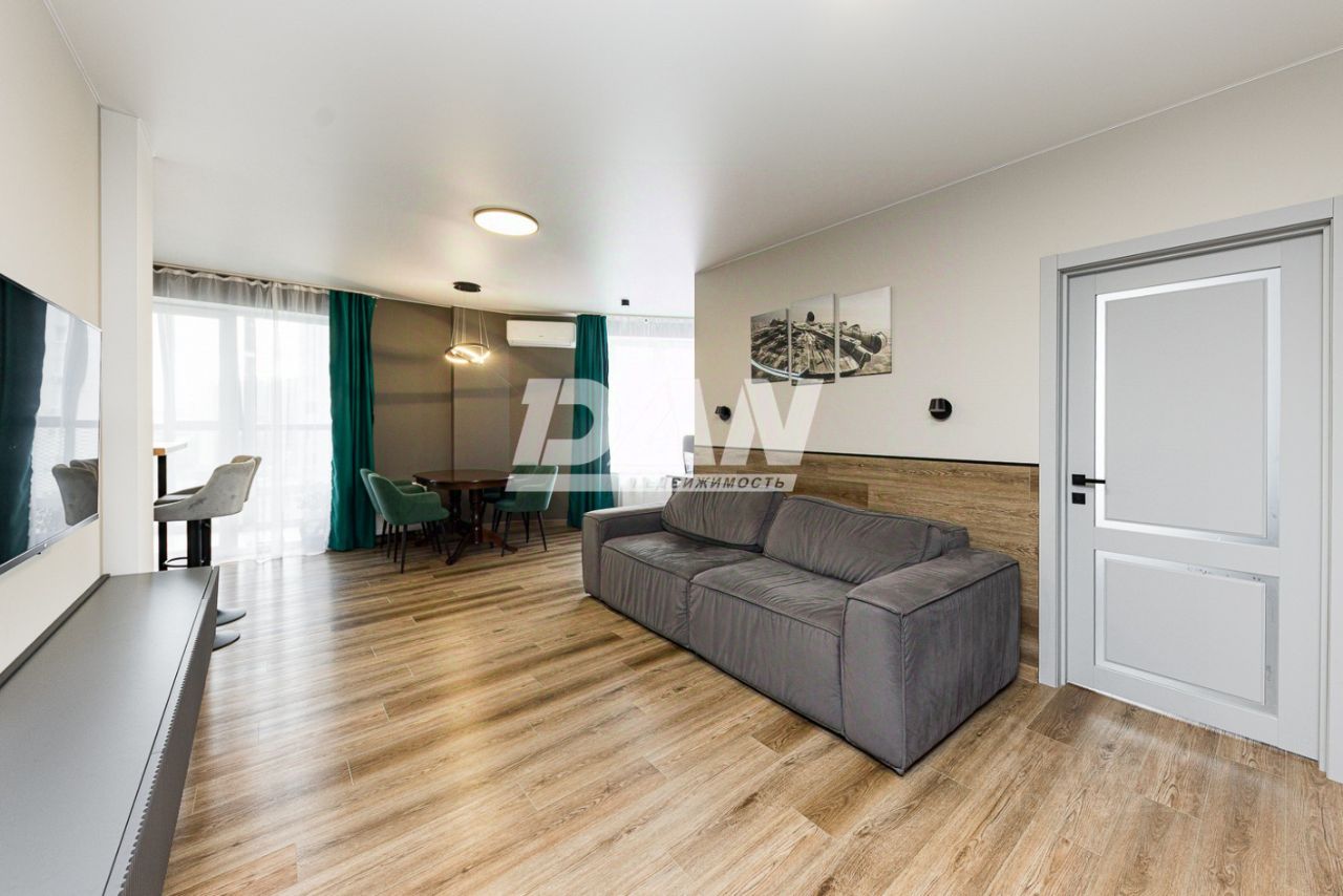 Планировка квартиры включает в себя: просторную кухню-гостиную 45,3 кв.м. с выходом на обустроенный балкон 5,8 кв.м с панорамным остеклением, спальню 15 кв.м, детскую комнату 19,8 кв.м, обустроенную гардеробную 4,9 кв.м, совмещенный санузел 5,6 кв.м, коридор. Окна квартиры выходят на южную и юго-западную сторону, из которых открывается красивый вид на город.