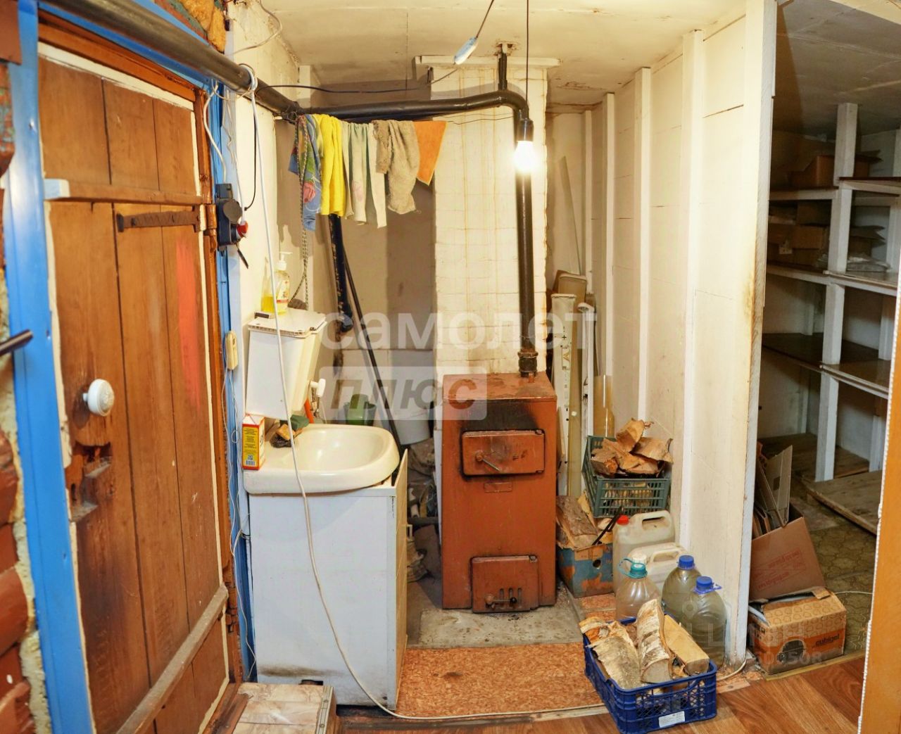 Внутри: большое торговое помещение, котельная и кладовая. Отопление от твердотопливного котла, есть возможность подключения к газовому снабжению, стояк газа подведен к дому. Полы устланы линолеумом, имеется видеонаблюдение для безопасности.