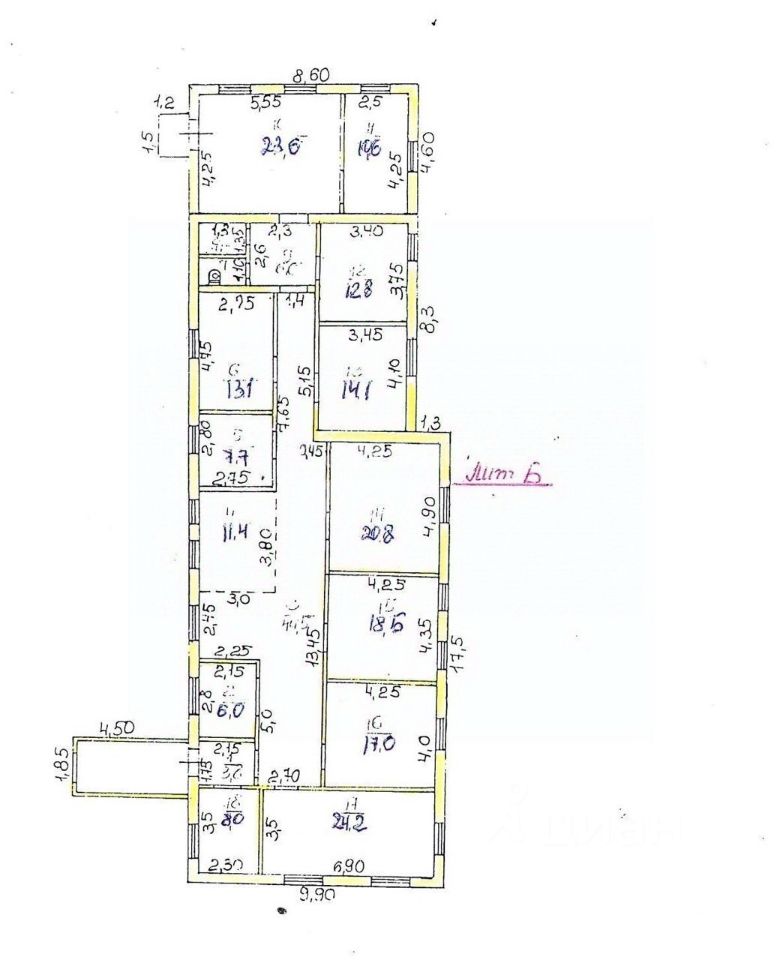 • 15 помещений, высота потолков — 3,5 м