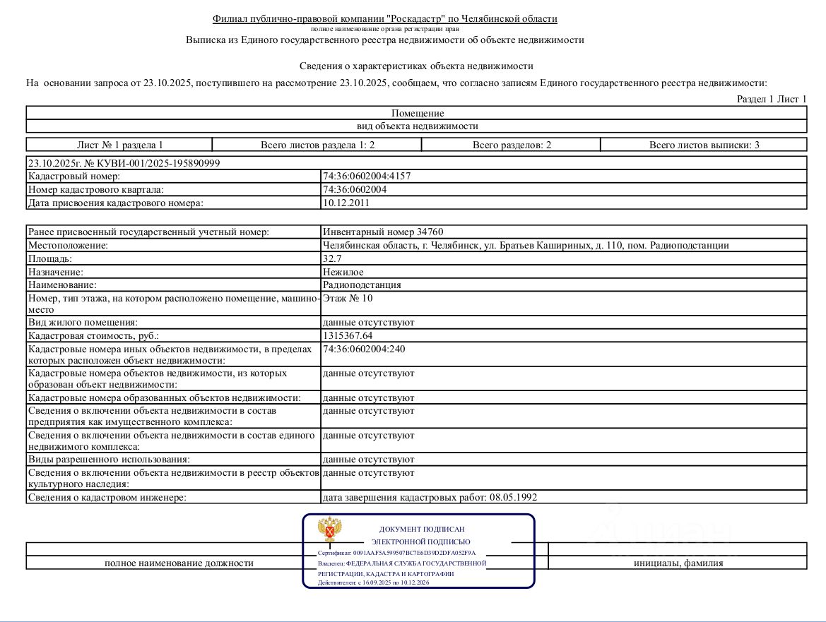 Данные получены с сайта ГИС Торги. Лот 2 Нежилое помещение, площадью 32,7 кв.м., кадастровый номер: 74:36:0602004:4157, реестровый номер: П13740011547, по адресу: Челябинская область, г Челябинск, ул. Братьев Кашириных, д. 110, пом. Радиоподстанции.